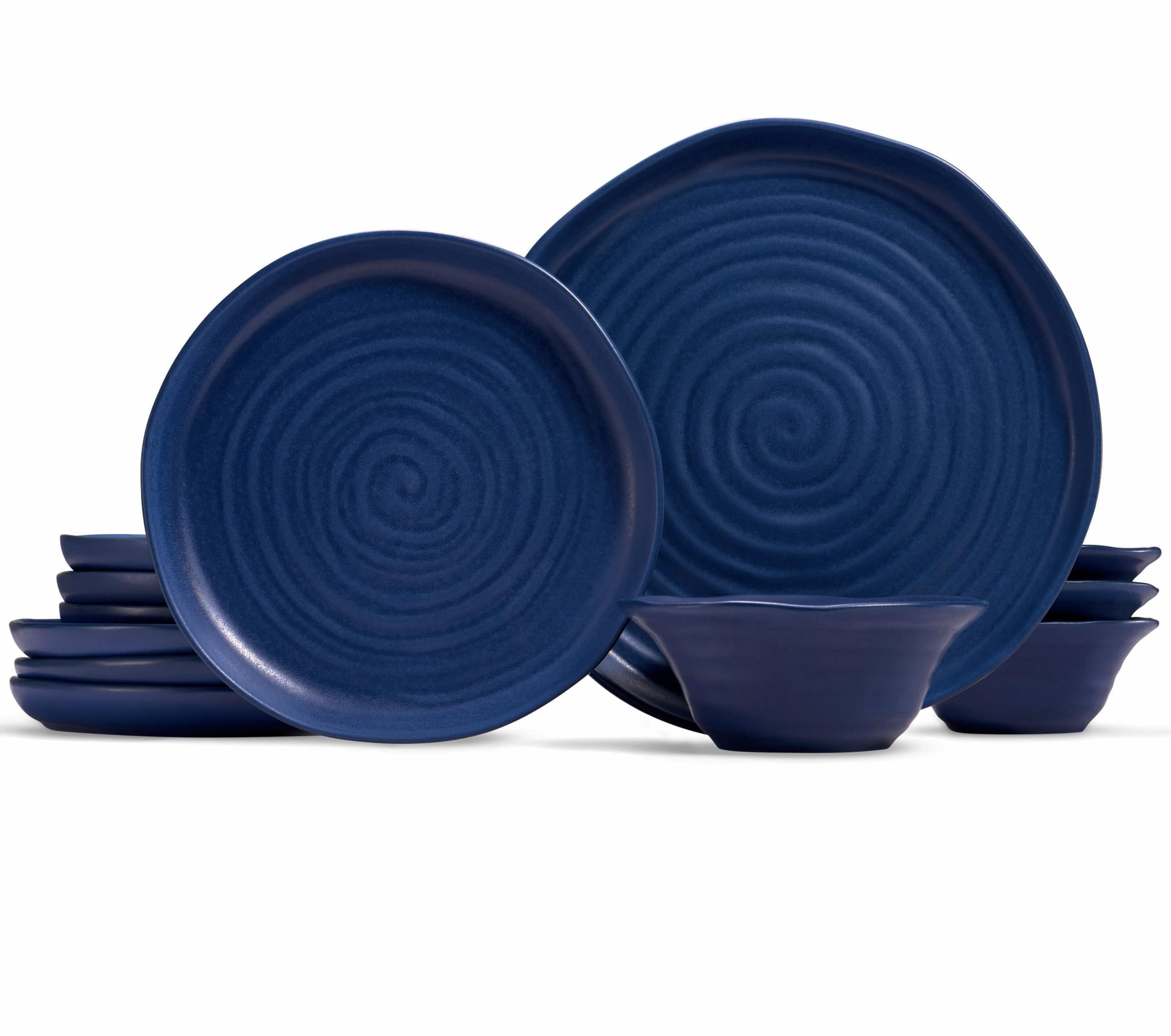 KooK Ceramic Dinnerware Set, Service for 4 (12-Piece) Plates & Bowls, Microwave & Dishwasher Safe, Organic Shape, Navy Blue Spiral|Kitchen & Dining