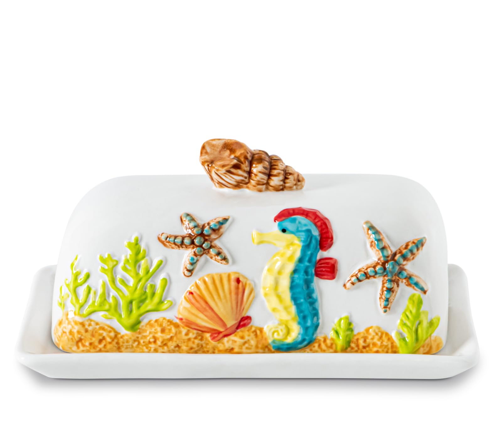 Ocean Theme Butter Dish With Lid For Countertop With Conch Scallop Starfish Seahorse Coral Decoration Funny Butter Container Cute Butter Dish Ceramic|Kitchen & Dining