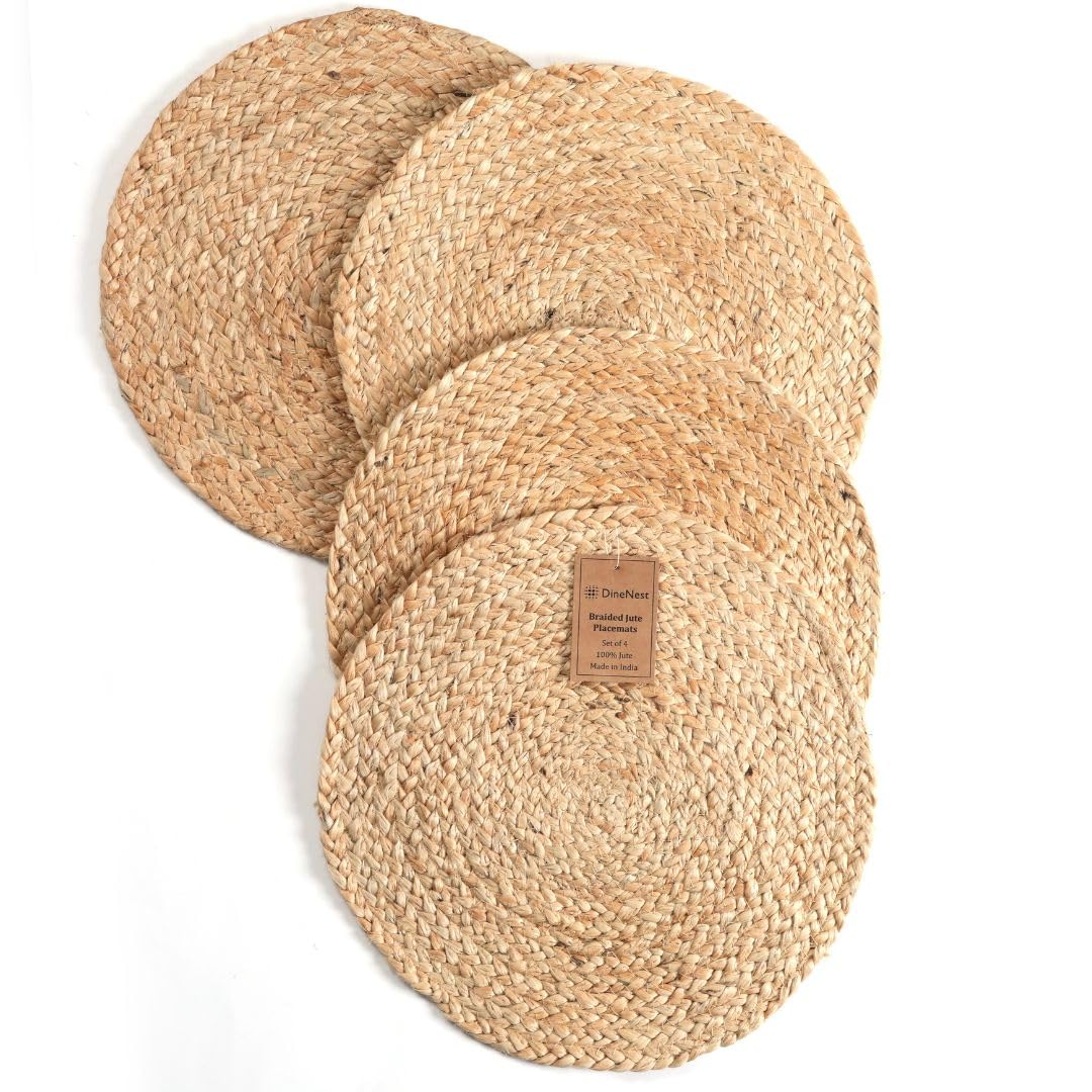 DineNest Set of 4 Handcrafted Jute Braided Placemats 14x14 Round 100% Jute - Farmhouse Rustic Vintage Placemats, Non-Slip Heat Resistant for Dining,|Kitchen & Dining