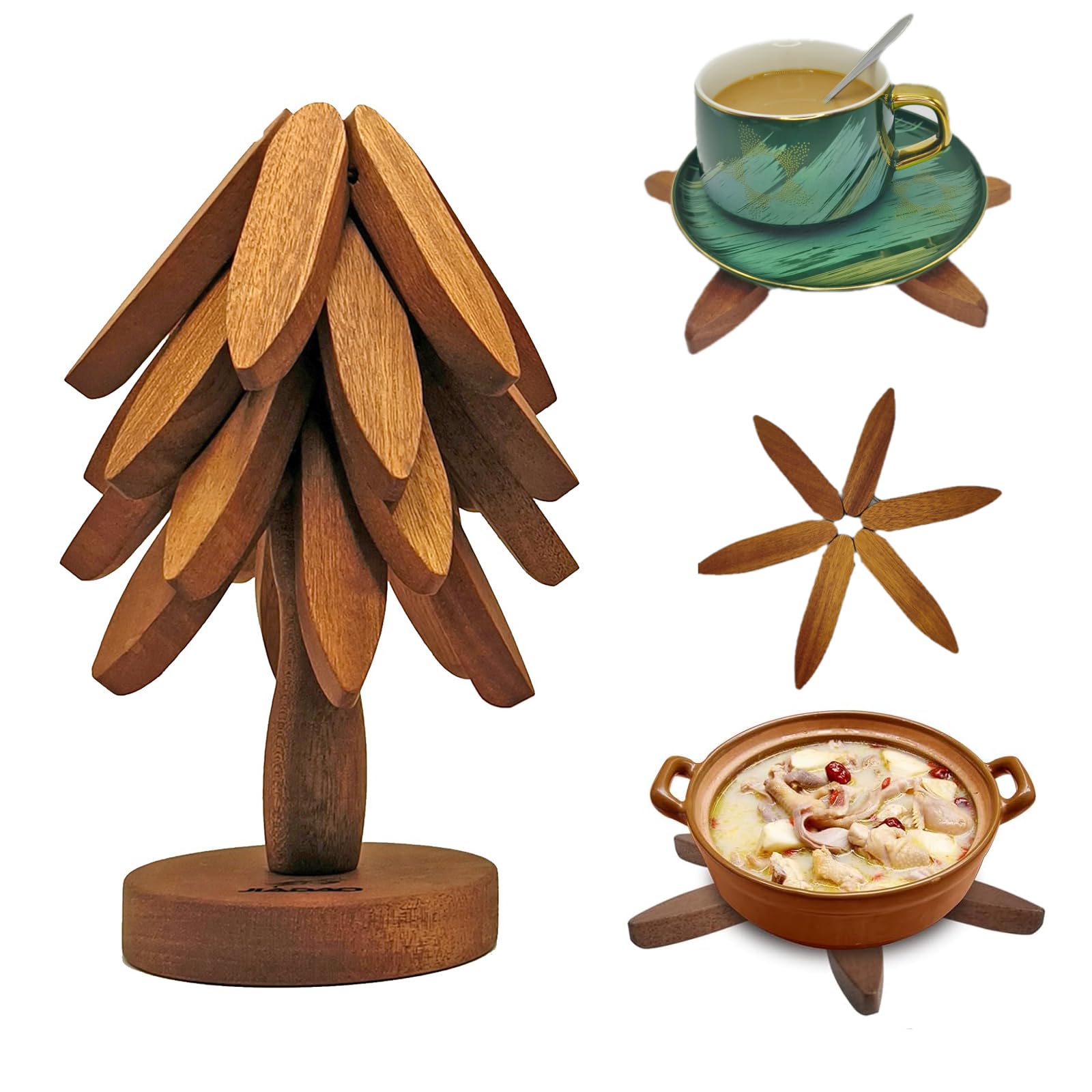 JIADAO Auto-Folding Trivet Set - 4 Sapele Wood Coasters for 450°F Hot Pots/Pans, Wall-Mountable Kitchen Organizer with Heat-Resistant Stand,|Kitchen & Dining