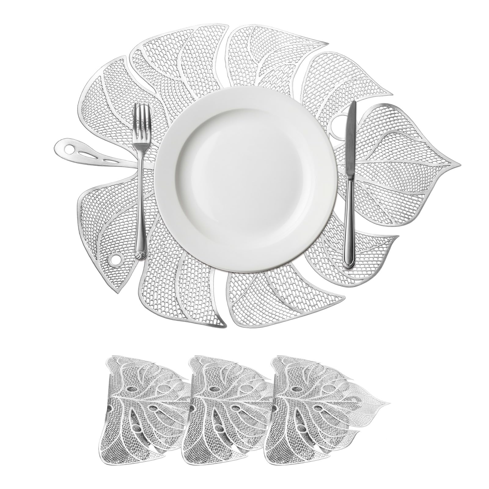 uxcell Silver Palm Leaf Shaped Placemats Set of 4 for Dinner Tables, Metallic Polyvinyl Pressed Placemats Washable Table Mats for Dinner Table Decor (|Kitchen & Dining