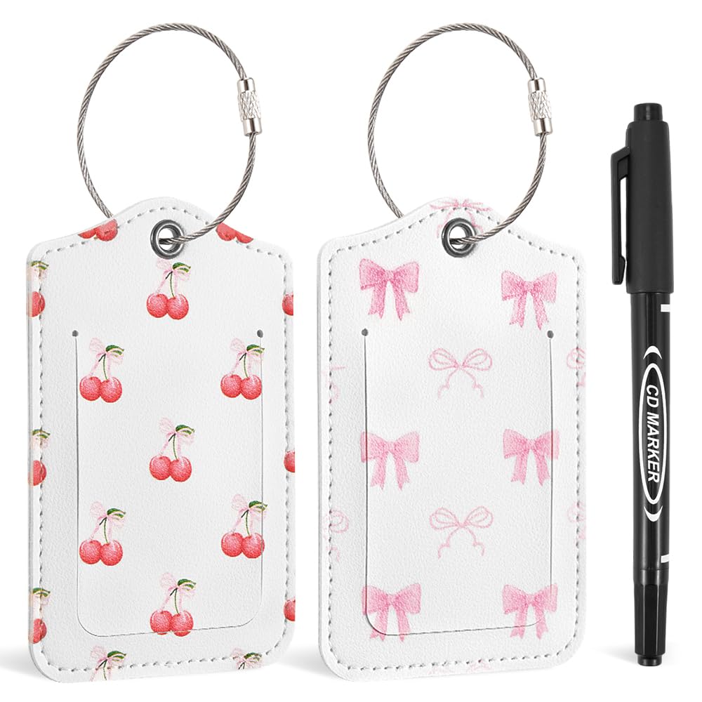 Nyvralora 2 Pcs PU Leather Luggage Tags with 1 Pen for Suitcase, Coquette Pink Bow Cherry Travel Cruise Luggage Tag with Privacy Flap ID Label Metal|Luggage & Bags