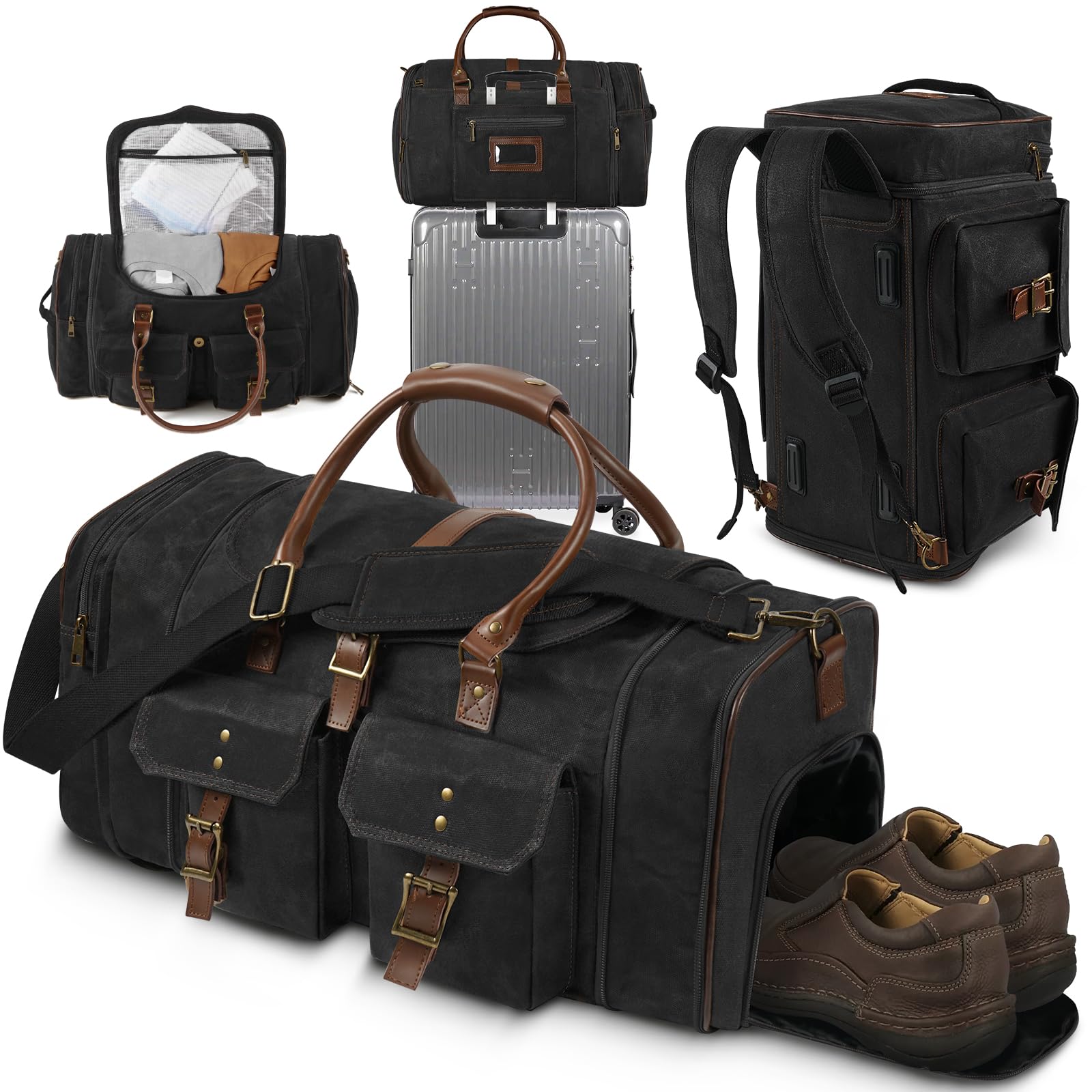 ARCFOX Vintage Waxed Canvas Duffle Bag for Men, Expandable to 45L Waterproof Weekender Overnight Travel Bag with Shoe Compartment, Adjustable Shoulder|Luggage & Bags