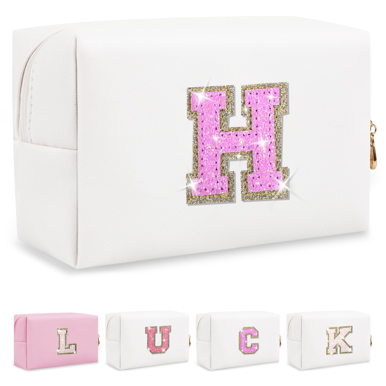 Personalized Initial Letter Makeup Bag, Small Glitter Letter Patch Cosmetic Pouch Zipper, Preppy Makeup Organizer PU Waterproof Travel Toiletry Bag,|Luggage & Bags