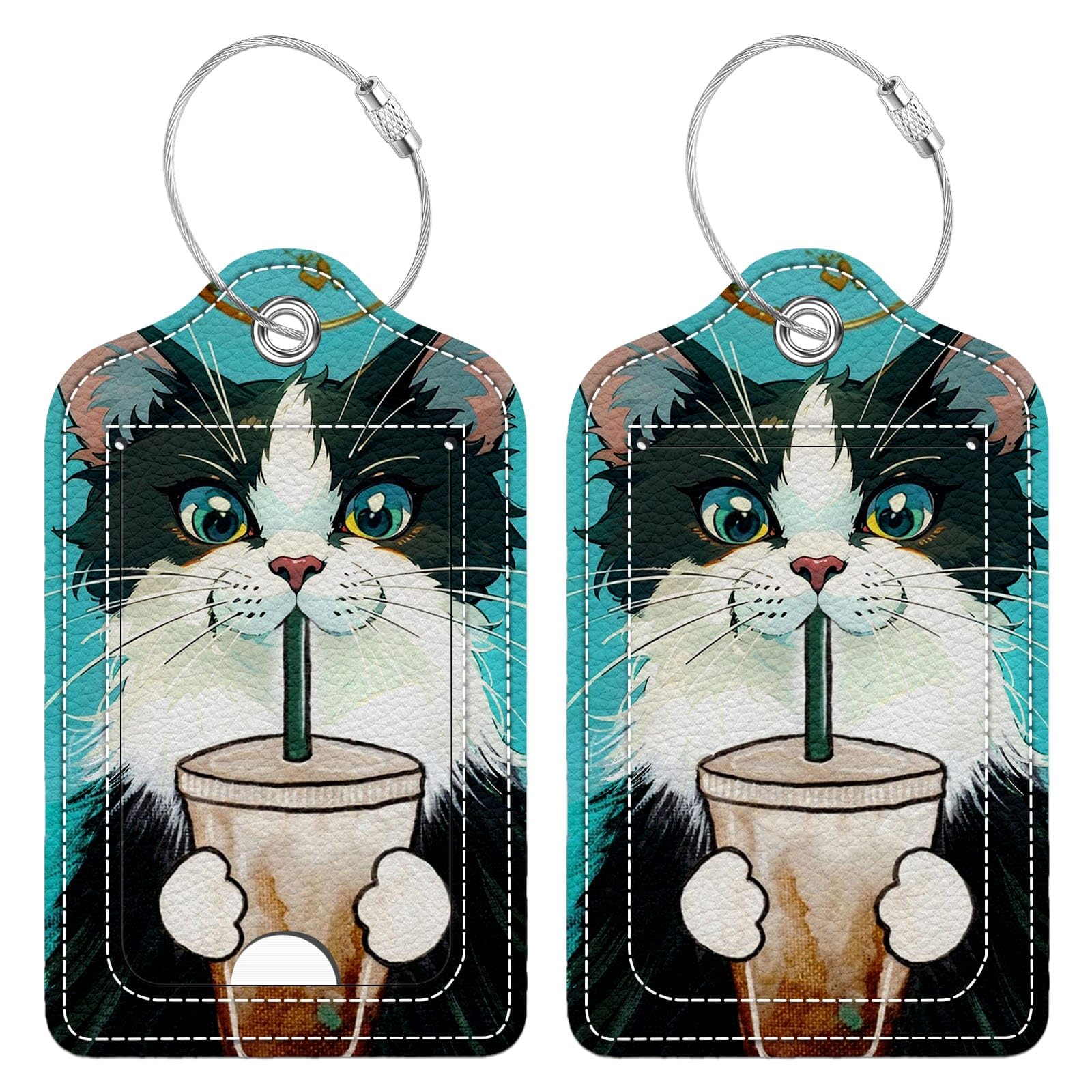 Funny PU Leather Luggage Tags 2-Pack Cat Drinking Coffee Cute Pattern Suitable for Suitcase Stainless Steel Loop and Address Card Essential for Cruise|Luggage & Bags