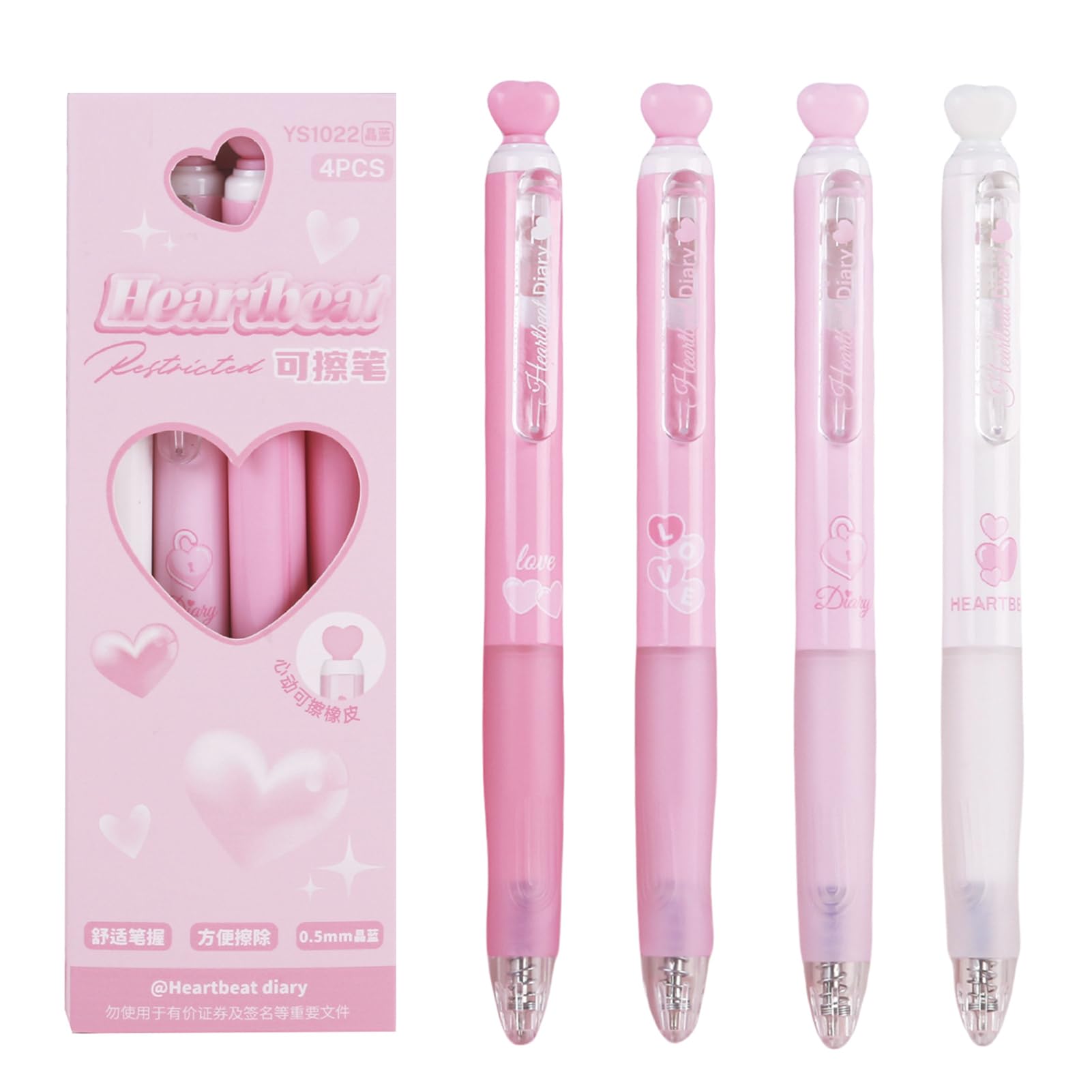 MOZXIRZ 4 Pcs Erasable Gel Ink Pens Cute Retractable Pens Aesthetic Pink Heart Pen 0.5mm Black Ink Erasable Pen for Women Girls Boys Men Office School|Office Supplies