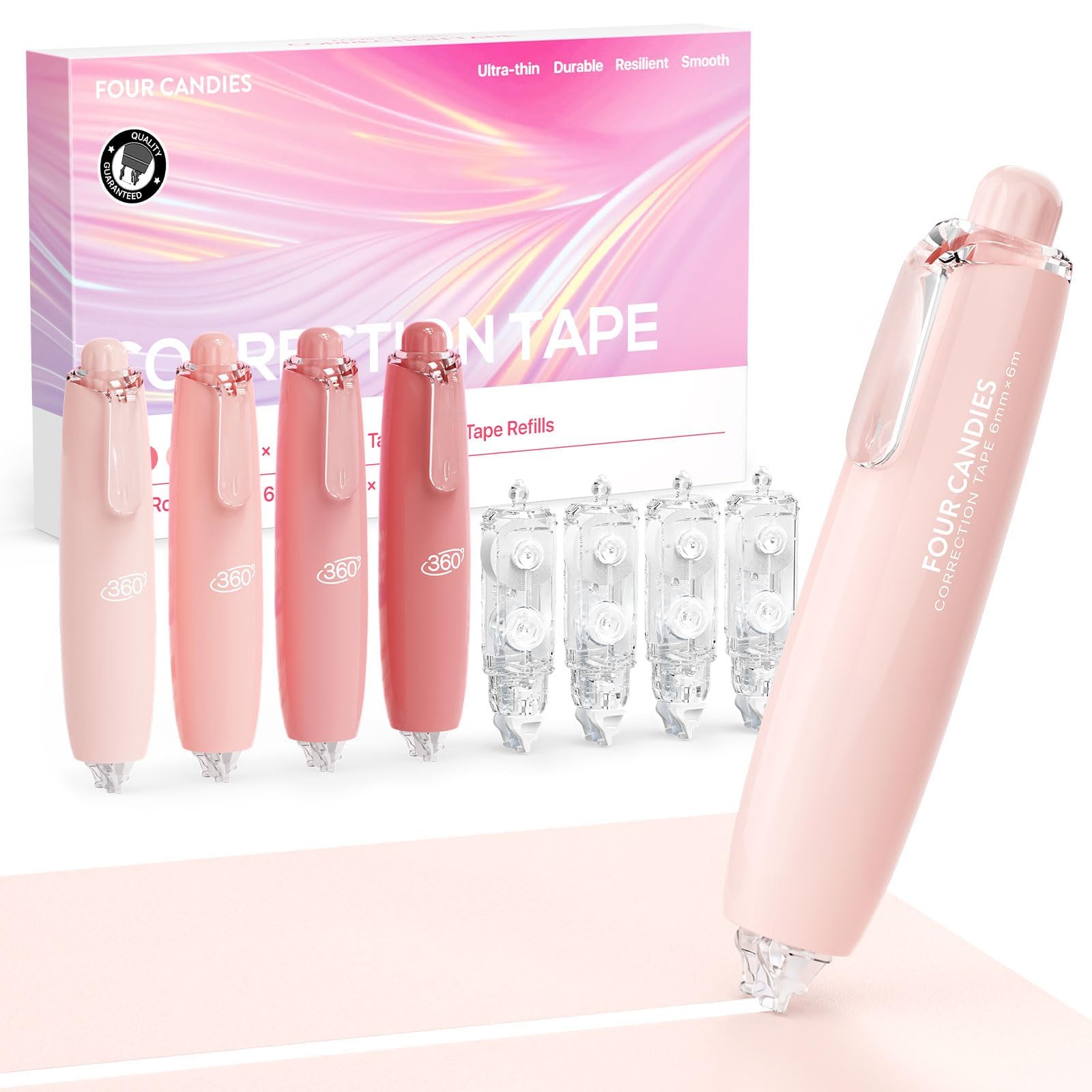 Four Candies Refillable Retractable White Correction Tape, 4PCS Smooth White Pull-Out Tape with 4 Extra Refills, Easy to Use Applicator for Instant|Office Supplies