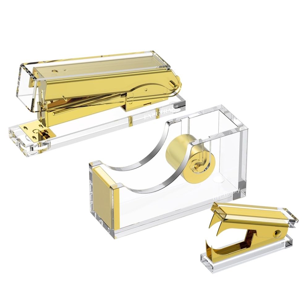 HER THEORY Gold & Acrylic Office Supplies Kit- Stapler, Tape Dispenser, Staple Remover | Clear Desk Supplies & Modern Accessories for Home, Office,|Office Supplies