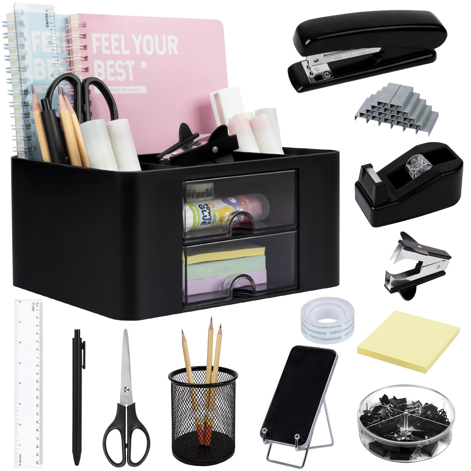 Black Desk Organizers and Accessories 12+1Pcs, Office Supplies for Desk, Pen Organizer with 2 Drawers with Stapler,1000 Staples, Phone Holder, Tape|Office Supplies