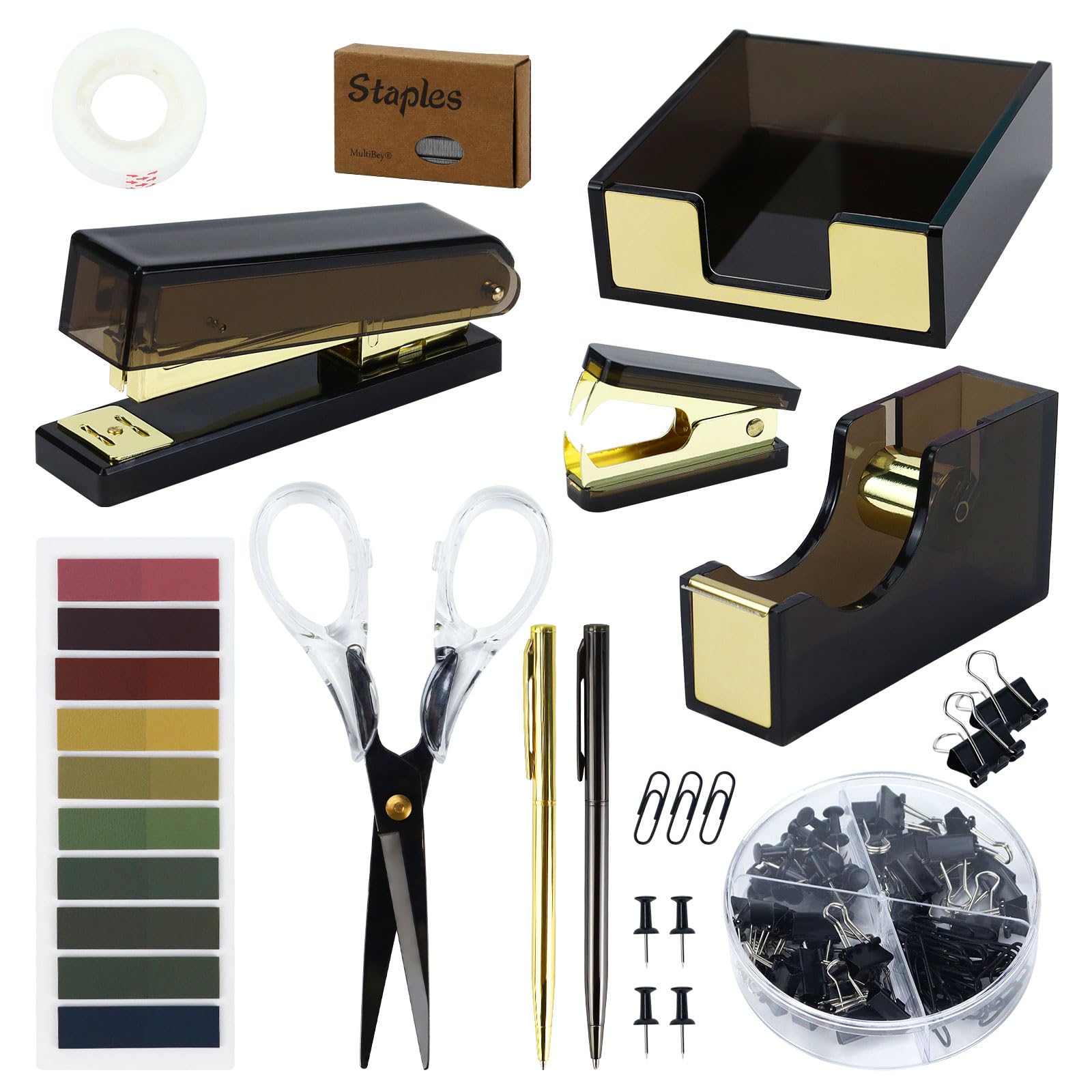Buqoo Black Acrylic Sticky Notes Holder Stapler and Tape Dispenser Cutter with Staple Remover, Sticky Notes, Paper Clips, Scissor, Ballpoint Pen for|Office Supplies
