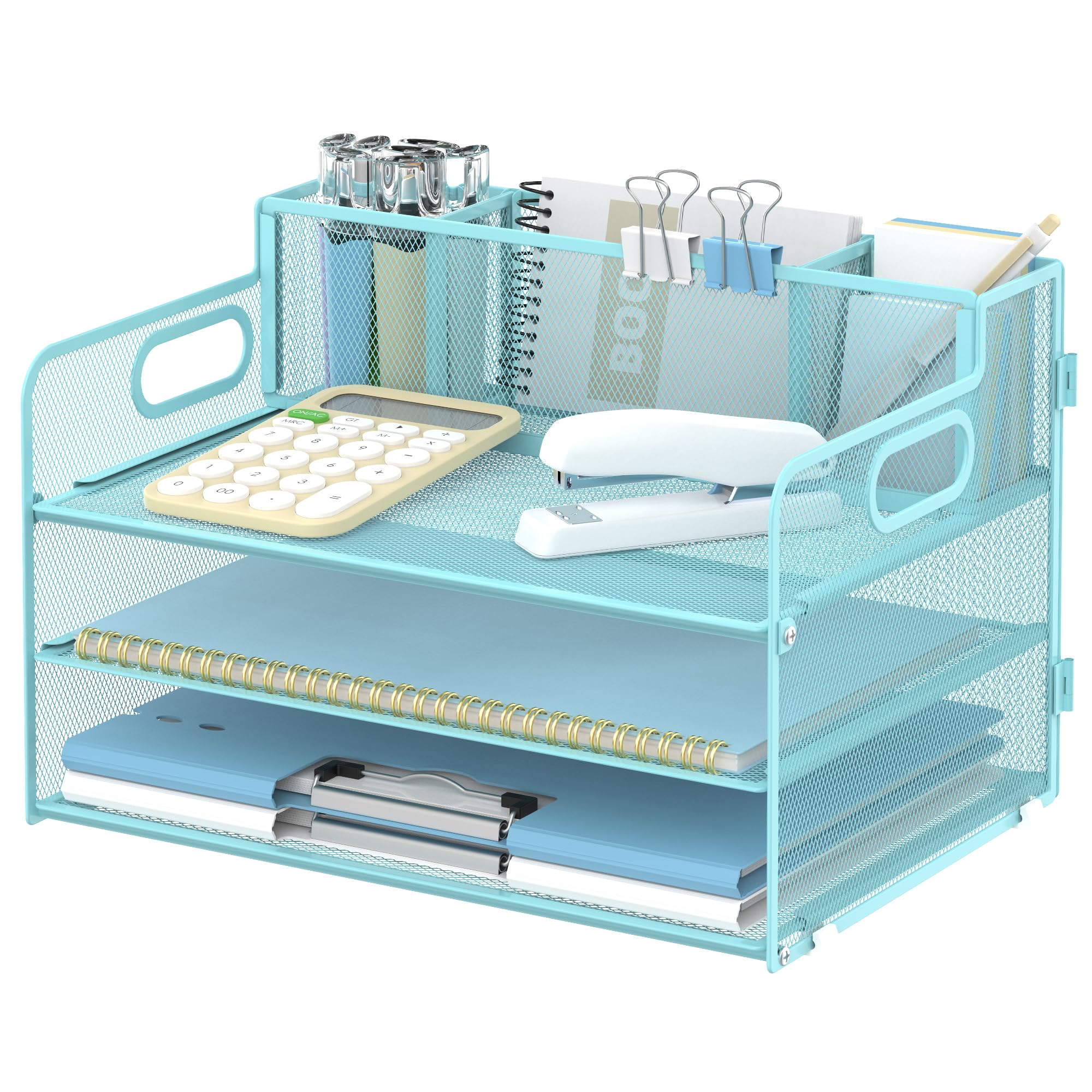 SUPEASY 3 Tier Desk Organizer with Handle & 3 Pen Holders, Mesh Paper/File Organizer for Desk, Paper Letter Tray Organizer for Office Supplies (Light|Office Supplies
