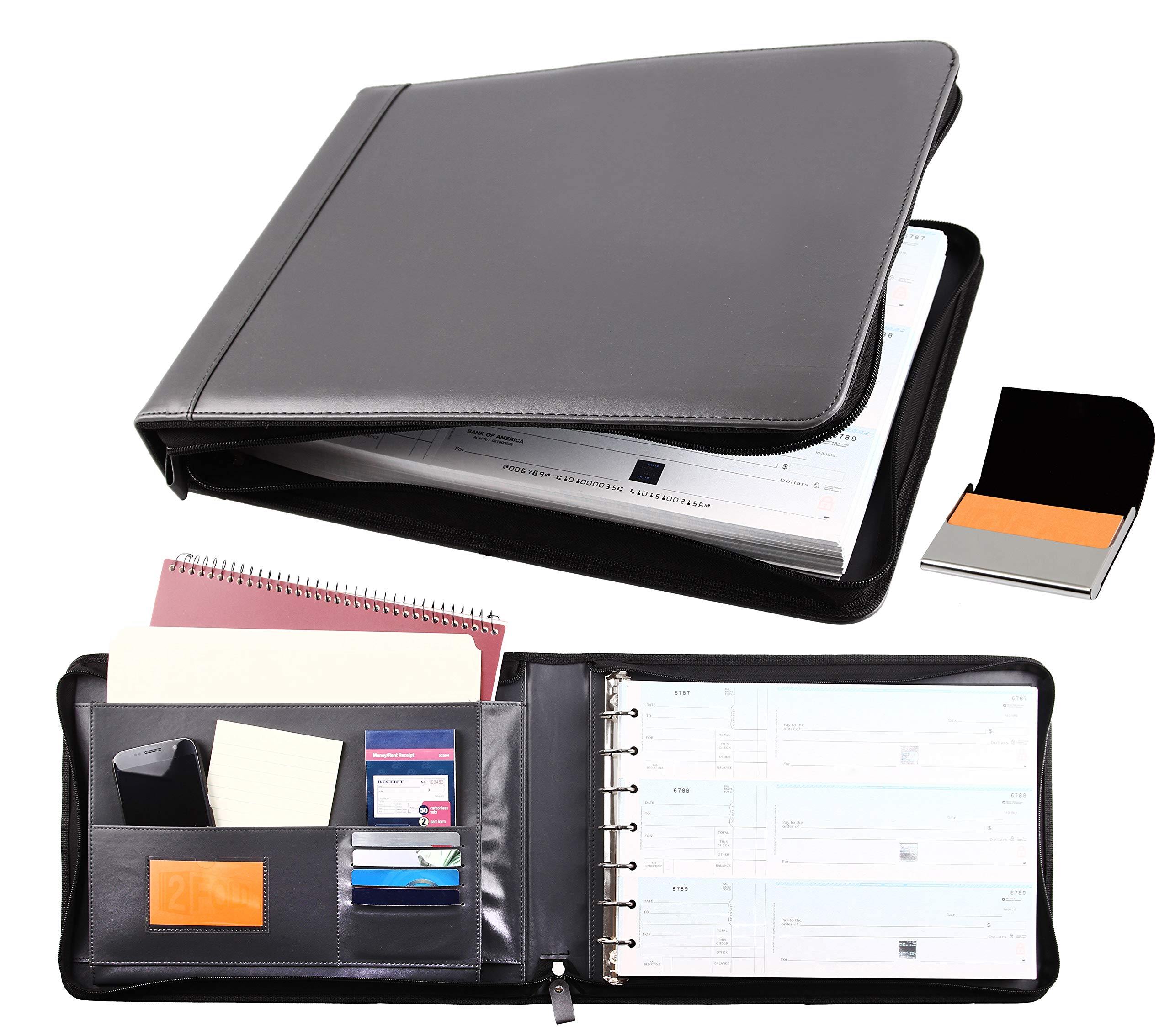 2Fold Zippered Business Checkbook Binder - 7 Ring Binder for Business Checks with Built-in Organizer and Card Case - PU Leather Portfolio for up to|Office Supplies