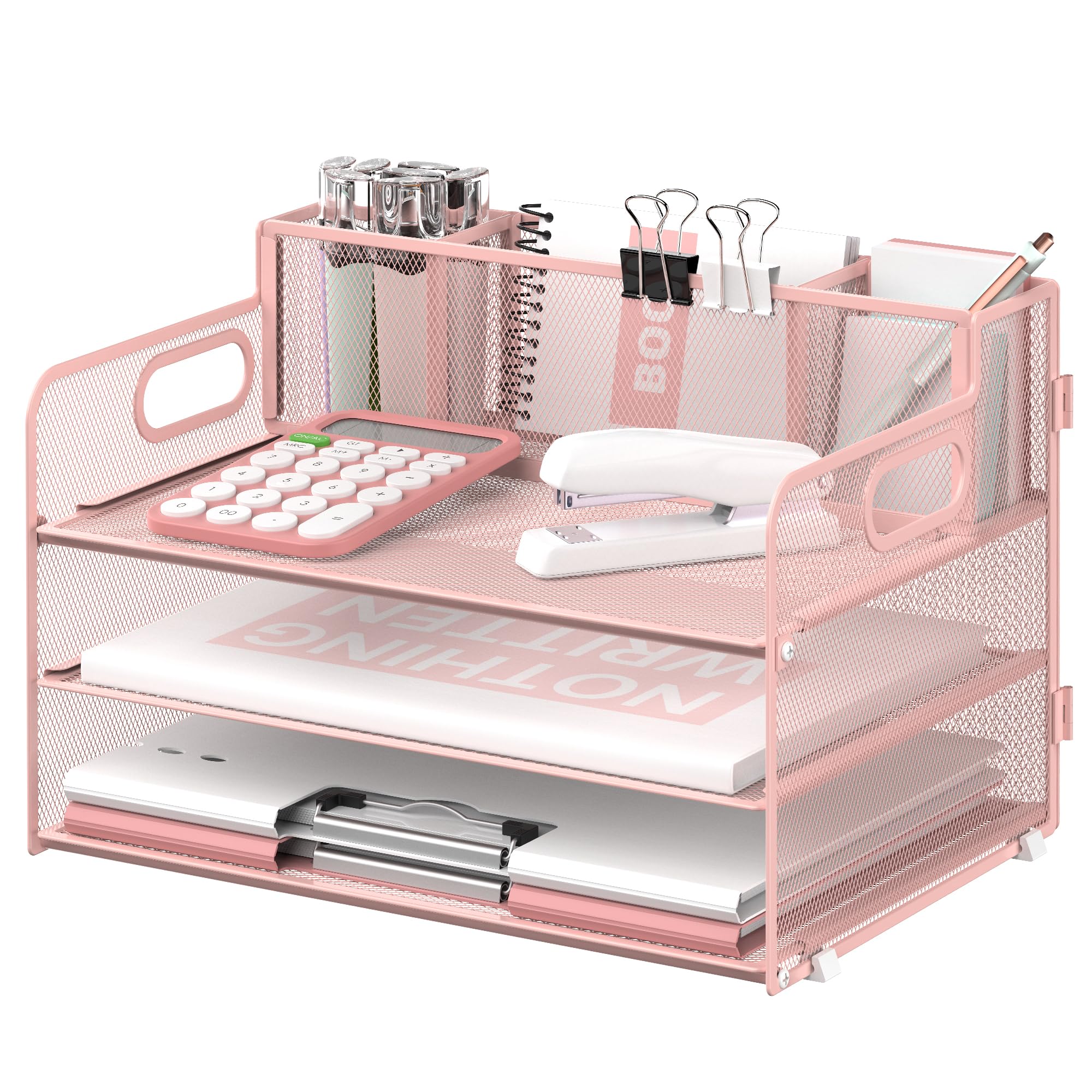SUPEASY 3 Tier Desk Organizer with Handle & 3 Pen Holders, Mesh Paper/File Organizer for Desk, Paper Letter Tray Organizer for Office Supplies (Cute|Office Supplies