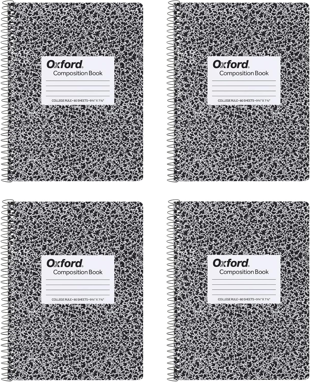 Oxford Spiral Composition Notebooks, 4 Pack, College Ruled Paper, 9-3/4 x 7-1/2 Inches, 80 Sheets, Black Marble Cover (64951)|Office Supplies