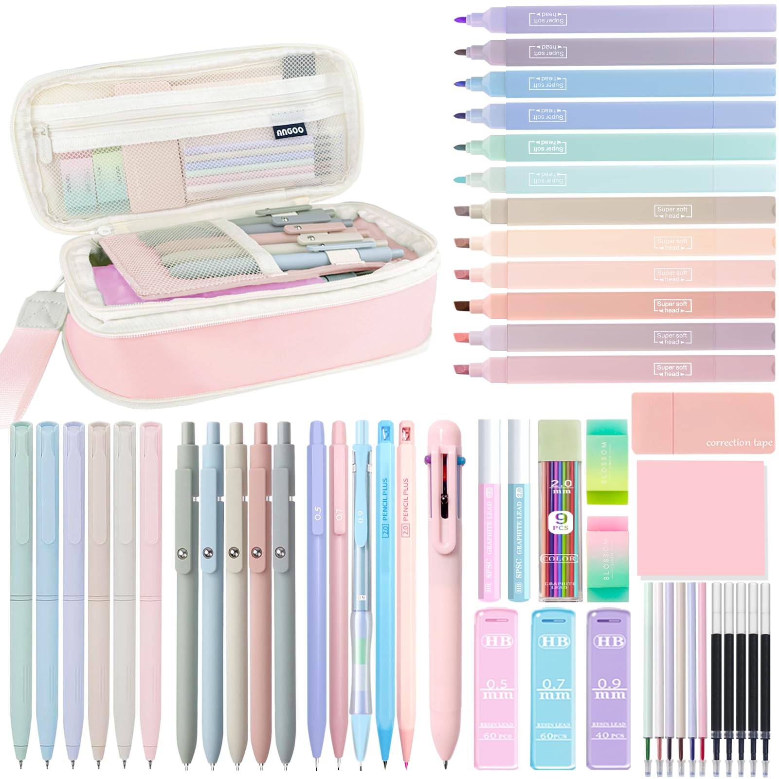 Four Candies 45 PCS School Supplies with Pen Case, 12 Pastel Highlighters, 6 Black Ink Gel Pens, 6 Mechanical Pencils Set for Students Stationary|Office Supplies