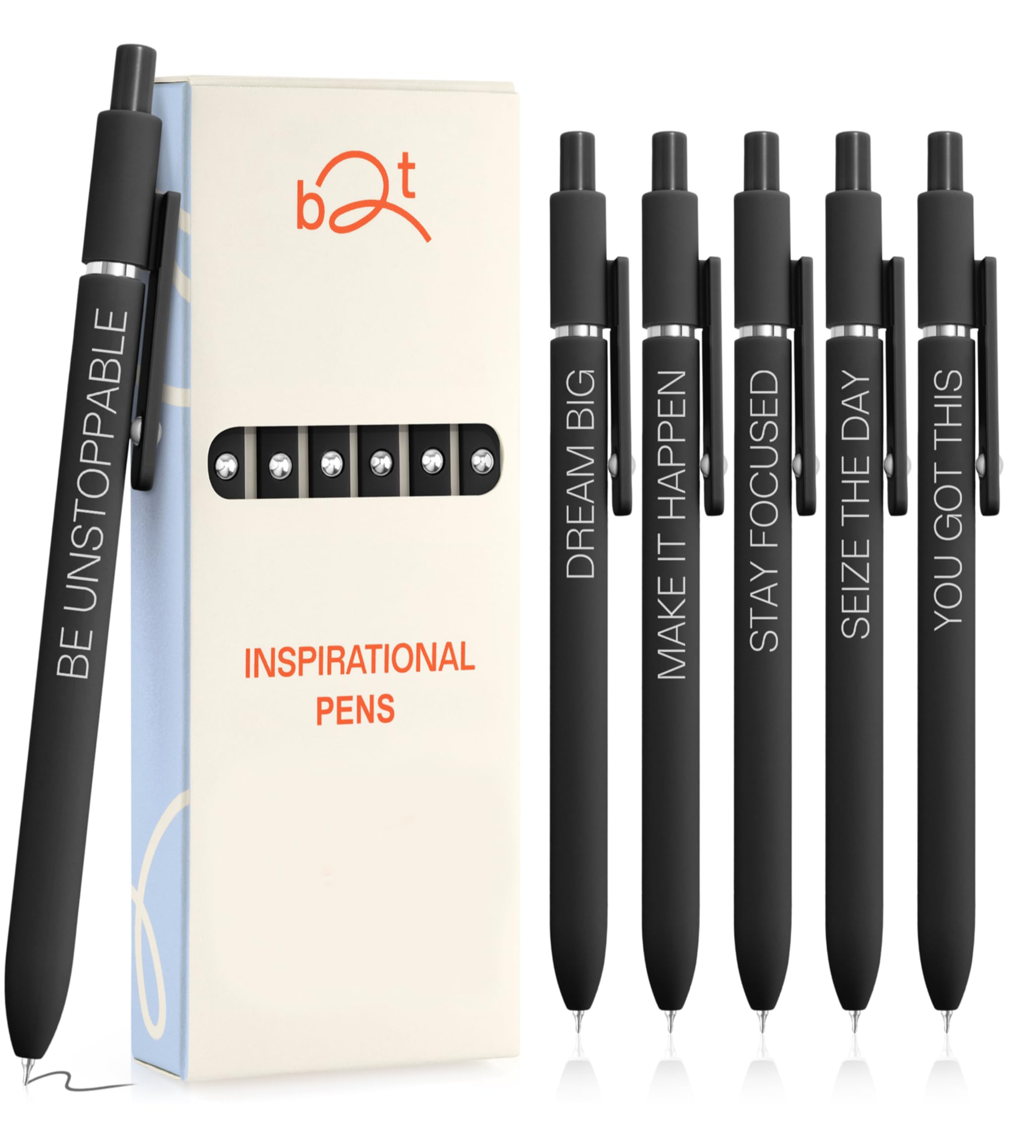 BETTER TOGETHER Achievers Inspirational Gel Pens, 6 Pack Black 0.5mm Fine Point, Quick Dry Black Ink, Soft Touch, Engraved Quotes – Office School|Office Supplies