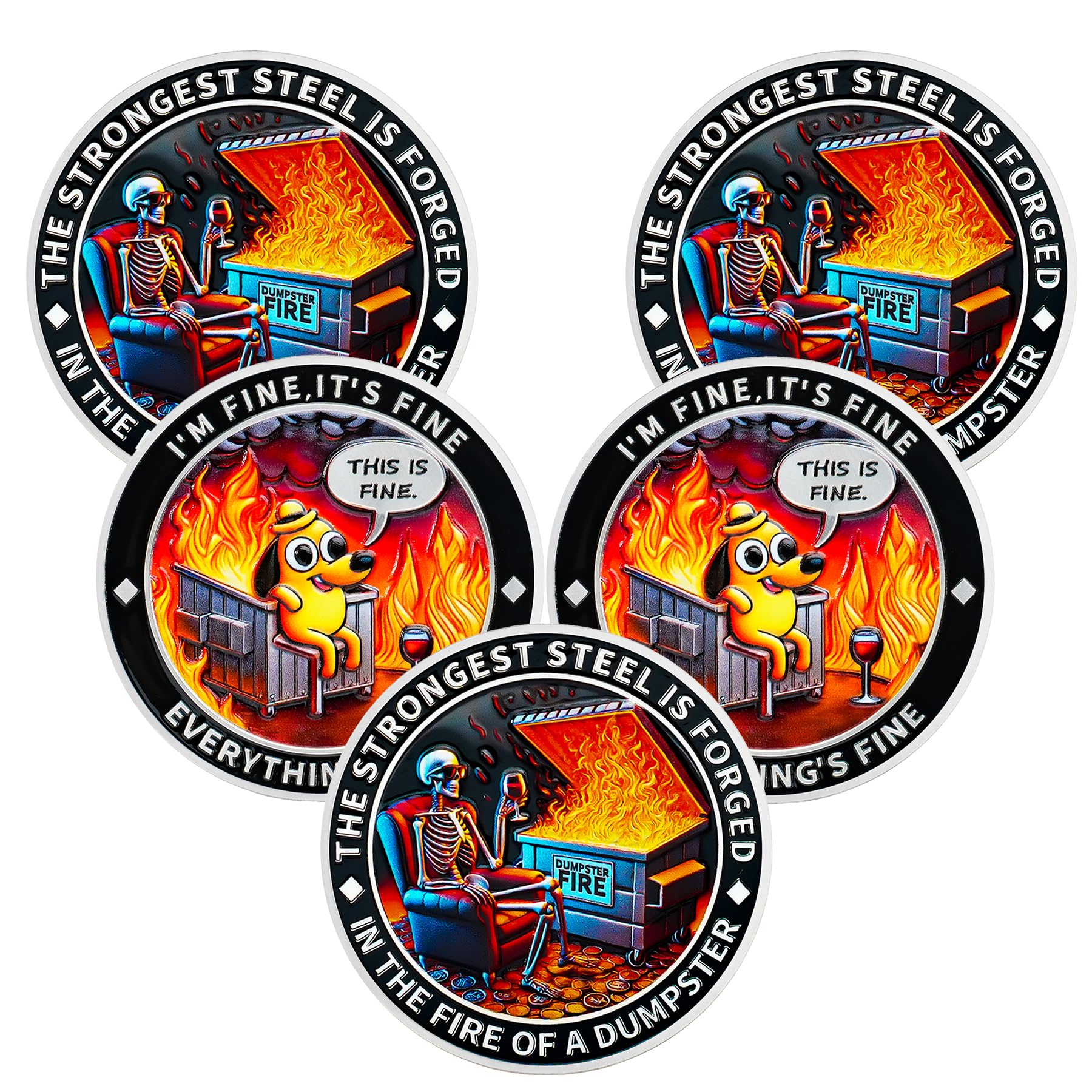 5PCS Skull Dumpster Fire Challenge Coin - The Strongest Steel is Forged Dumpster Fire Coin - Emotional Support This is Fine Chip - Funny Desk|Office Supplies