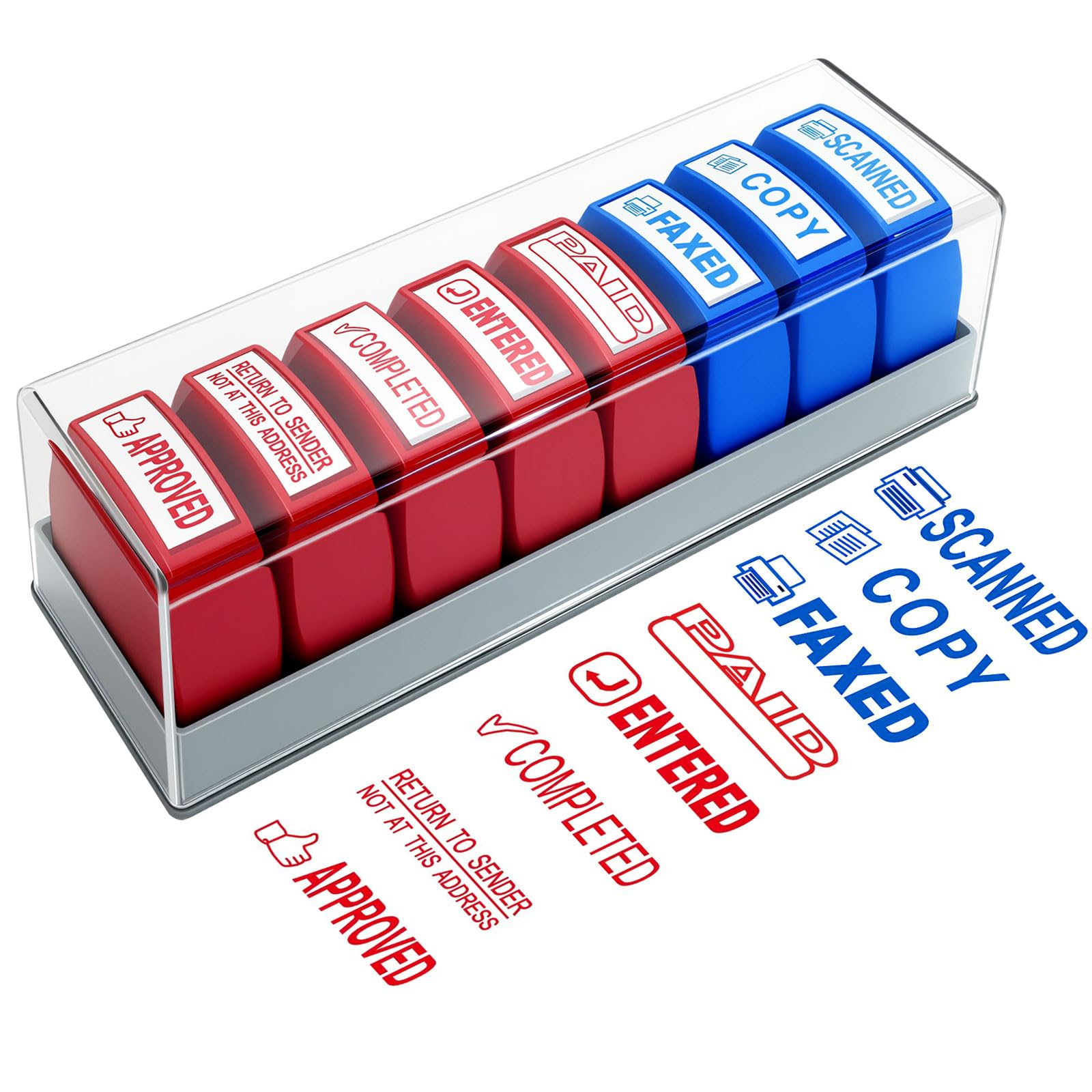 8PCS Office Stamps Set, Copy Paid Scanned Approved Completed Entered Return to Sender Faxed Message Stamp with Storage Tray, Rubber Business Stamp in|Office Supplies