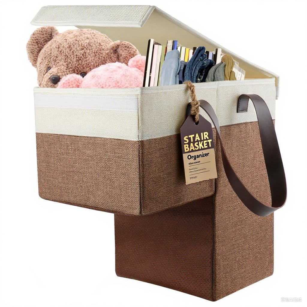 2025 NEW Foldable Stairs Basket Flax, L-Shape Stair Organiser Basket with Carry Handle and Lid, staircase baskets Stair Box, Non-slip Large Stair Tidy|Office Supplies