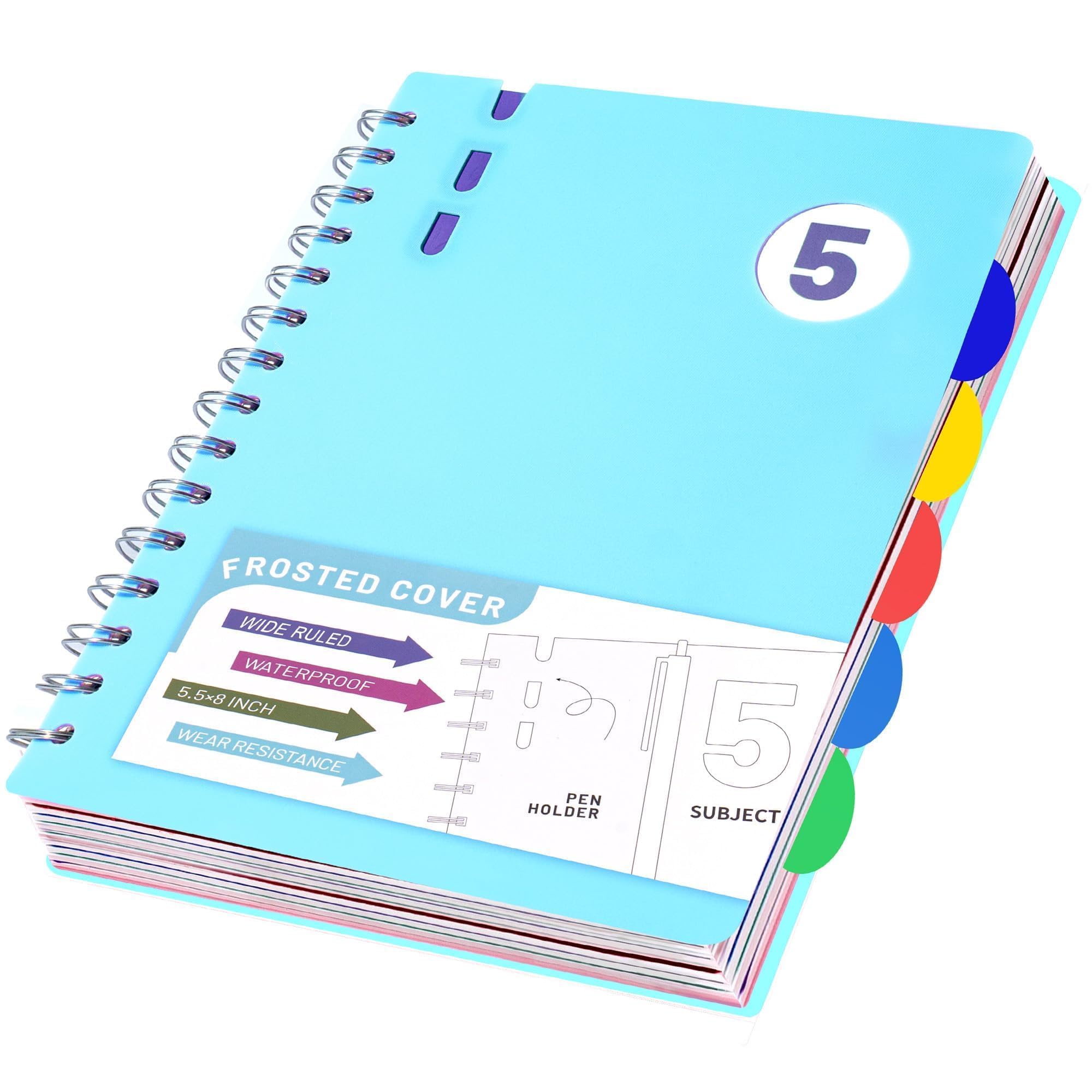 FLYING EAGLE 5 Subject Notebook Wide Ruled Spiral Notebook 5x7, A5 Small Notebook with Dividers, Hardcover Notebooks for Work, 204 Pages Lined Journal|Office Supplies