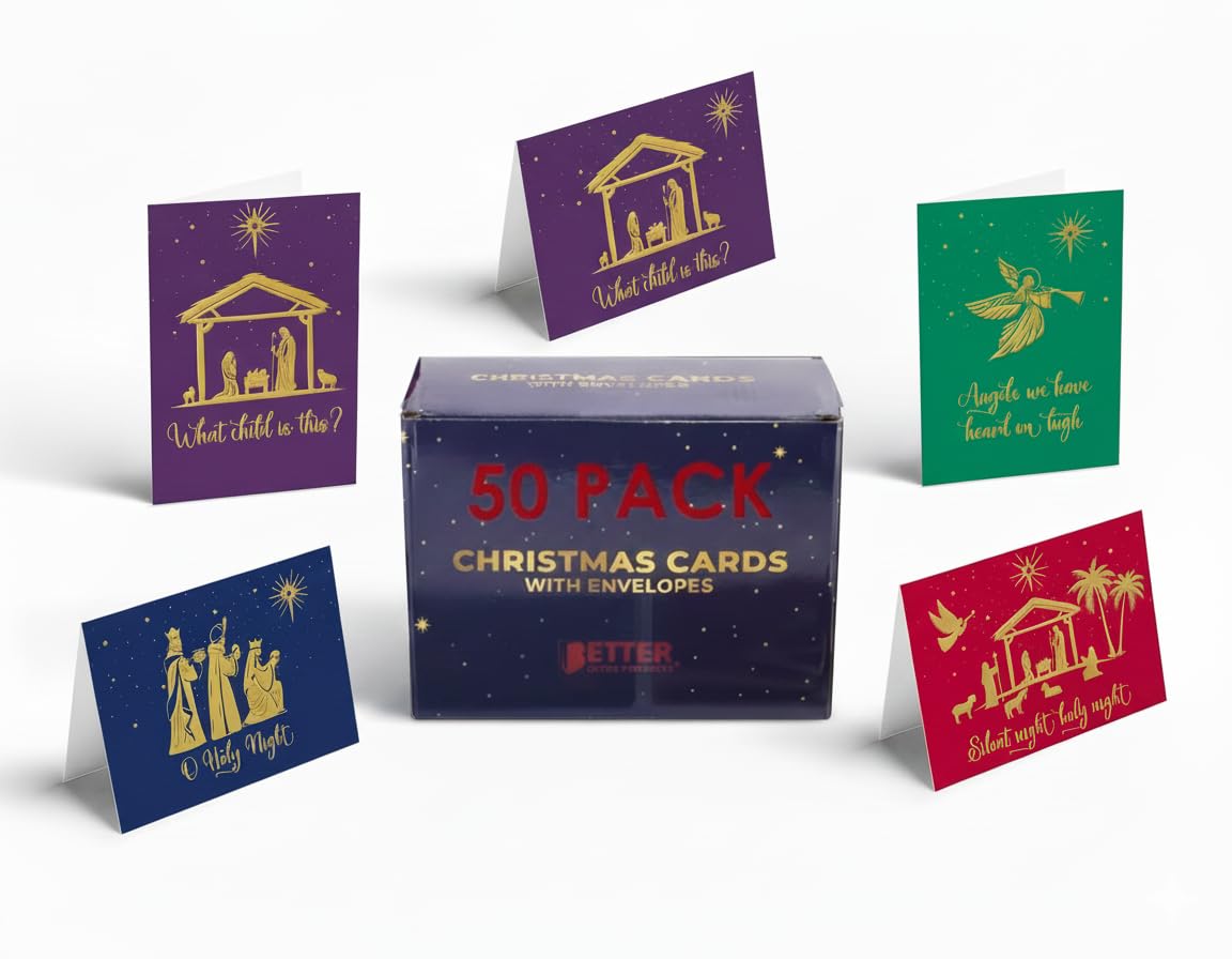 Better Office Products 50 Pack Religious Christmas Cards with Embossed Gold Foil Accents, 5" x 7", High Gloss, Gold Foil Interior Greeting, with 50|Office Supplies