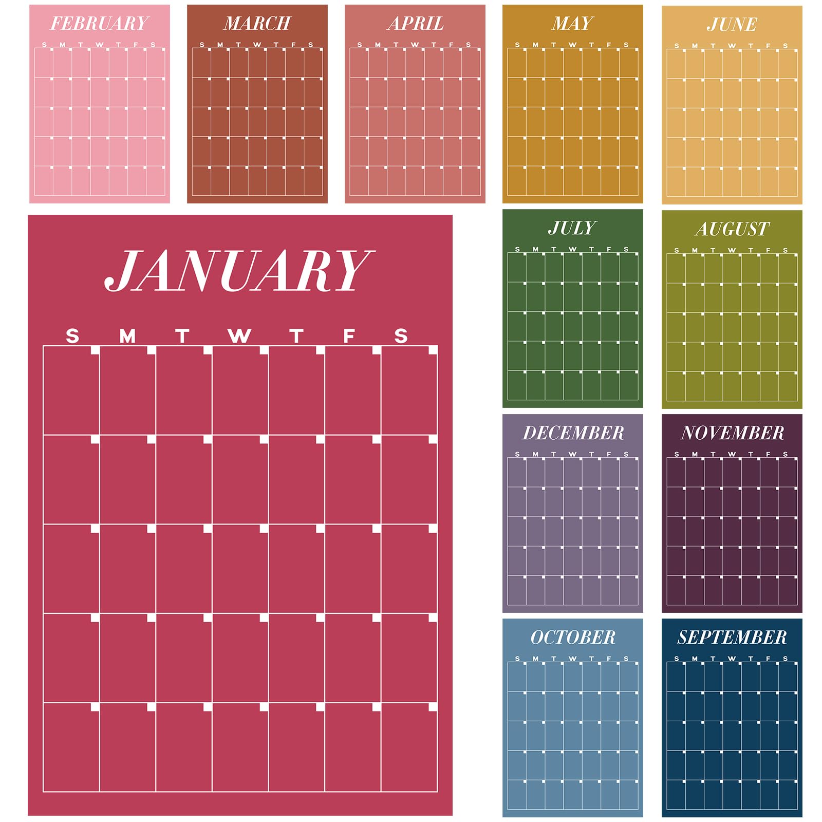 Fullhawl 2026-2027 Big Calendar 12 Pcs Colorful Large Wall Calendar 12‘'x16‘' Undated New Year Blank Planner Dry Ease Reusable Yearly Erasable Planner|Office Supplies
