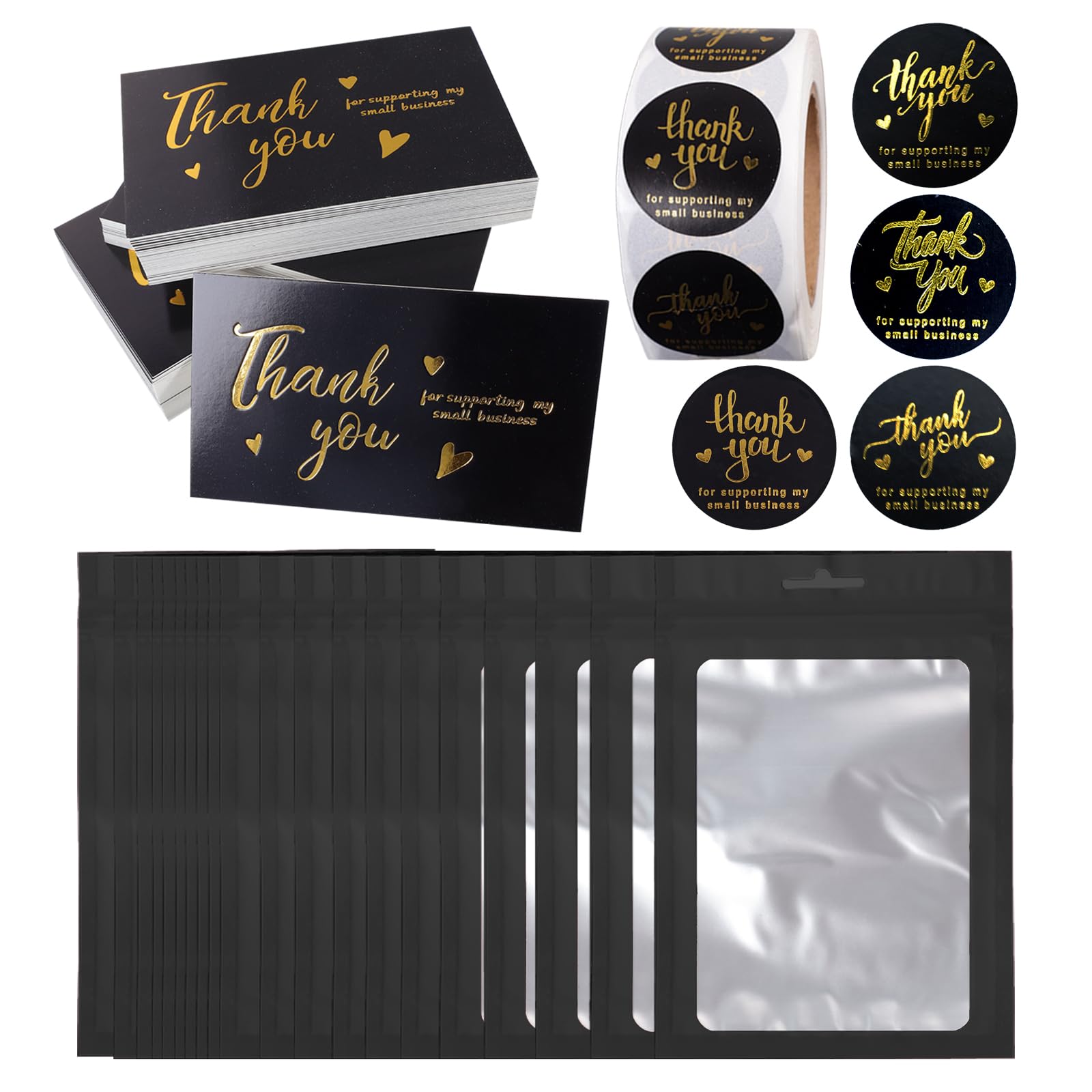 620pcs Thank You Business Cards & Stickers Set - Gold Foil, 100 Cards, 500 Stickers, 20 Resealable Bags (Black)|Office Supplies