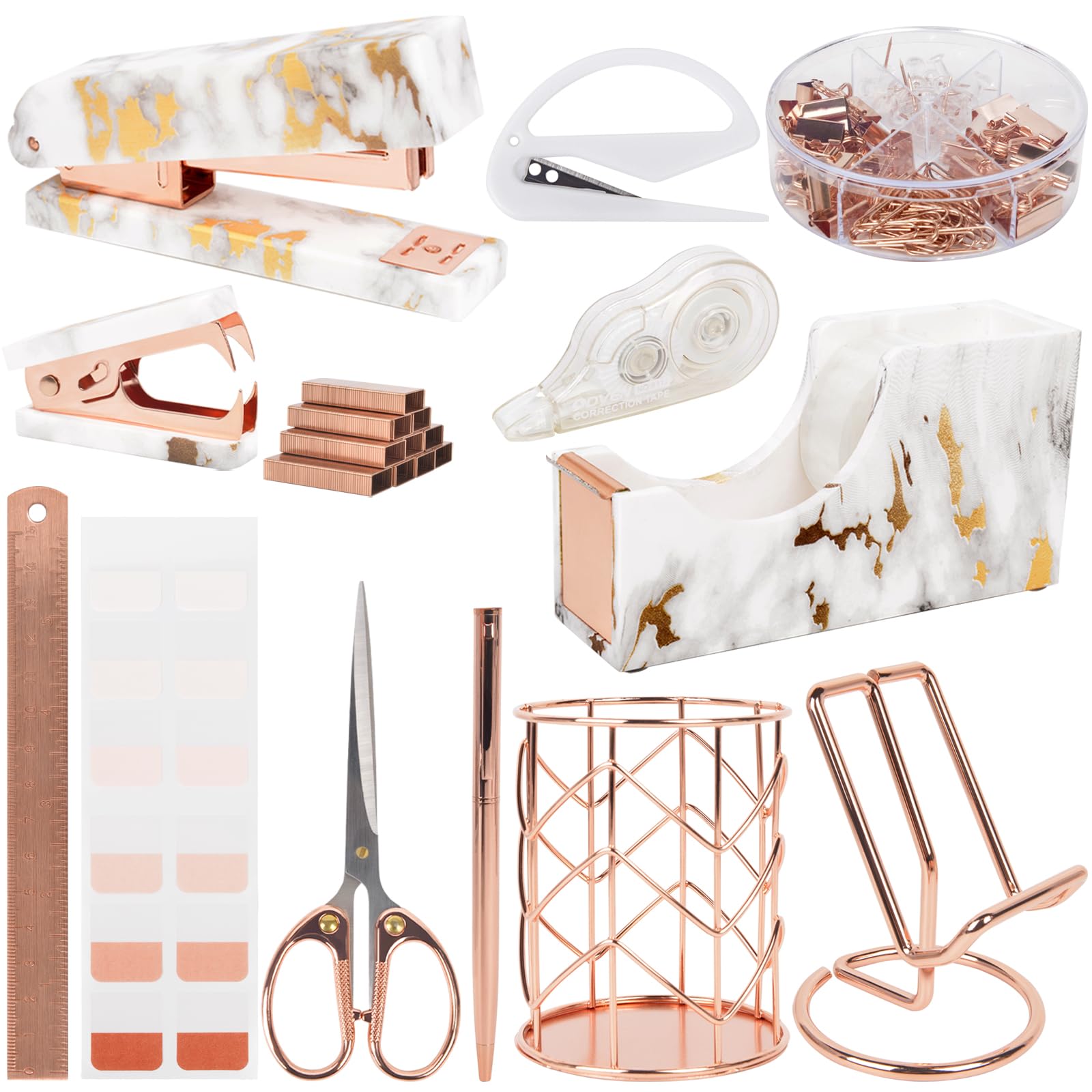 Office Desk Accessories Supplies - 14 Pcs Women Rose Gold Marble Desk Decor Set, Cute Aesthetic Office Essentials Kit, Stapler Tape Dispenser Pen|Office Supplies