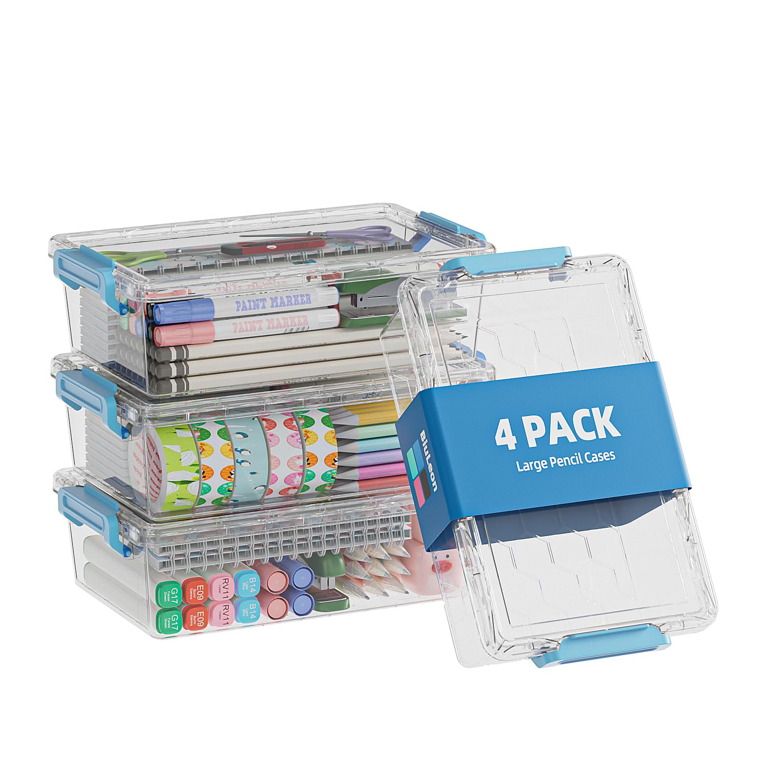 BiuLeon 4 Pack Extra Large Pencil Box, Plastic Pencil Case Organizer, Clear Crayon Box Marker Organizer, Stackable Craft Organizers and Storage for|Office Supplies