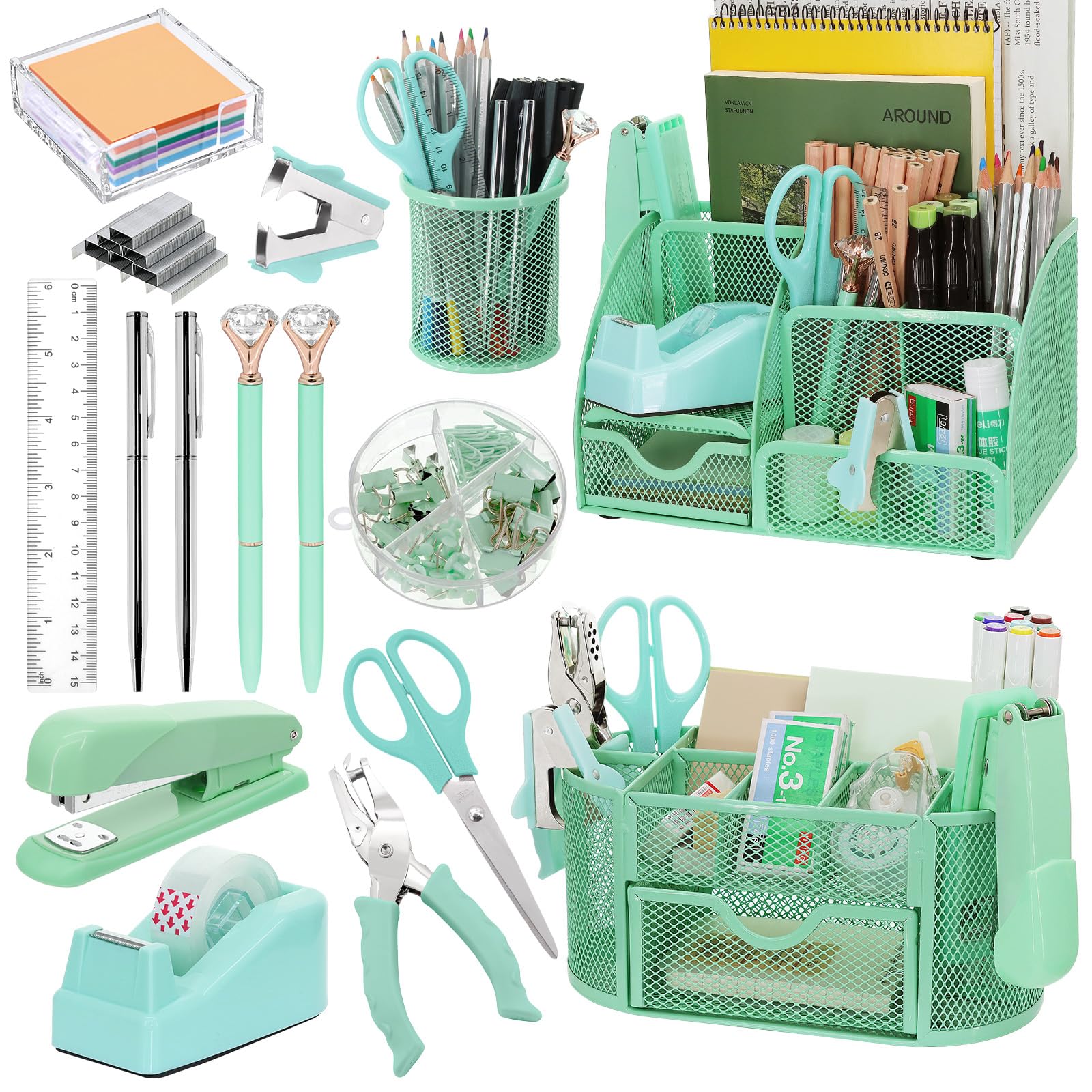 17 in 1 Green Desk Organizers and Accessories Set, 3 Office Desk Supplies Storage Organization, 4 Pens, Stapler, Staples & Remover, Tape & Dispenser,|Office Supplies