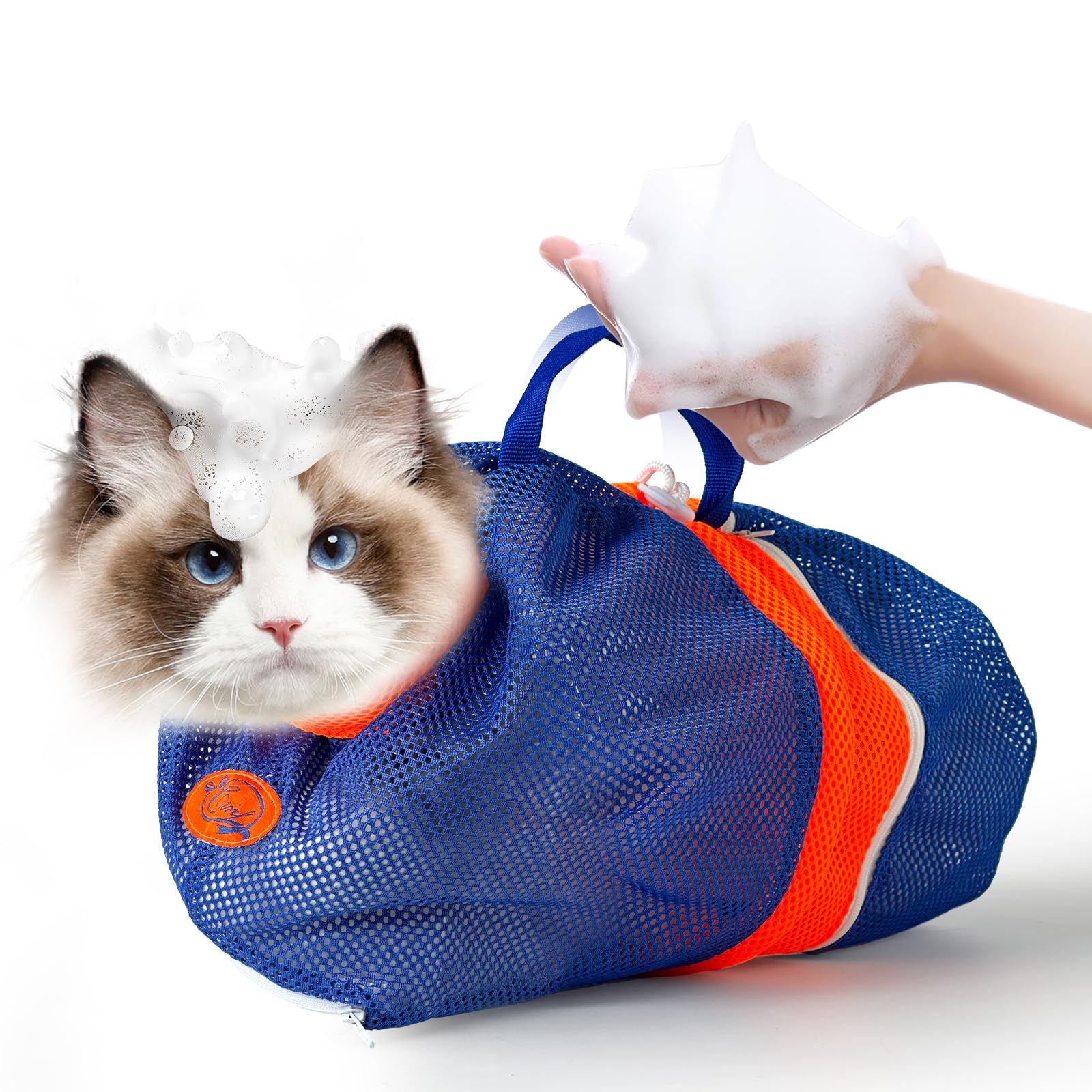 Cinf Cat Bathing Bag, Breathable Mesh Anti Scratch Adjustable Cat Grooming Bag for Nail Trimming, Bathing Soft Cat Washing Bag(Orange Blue) L|Pet Supplies