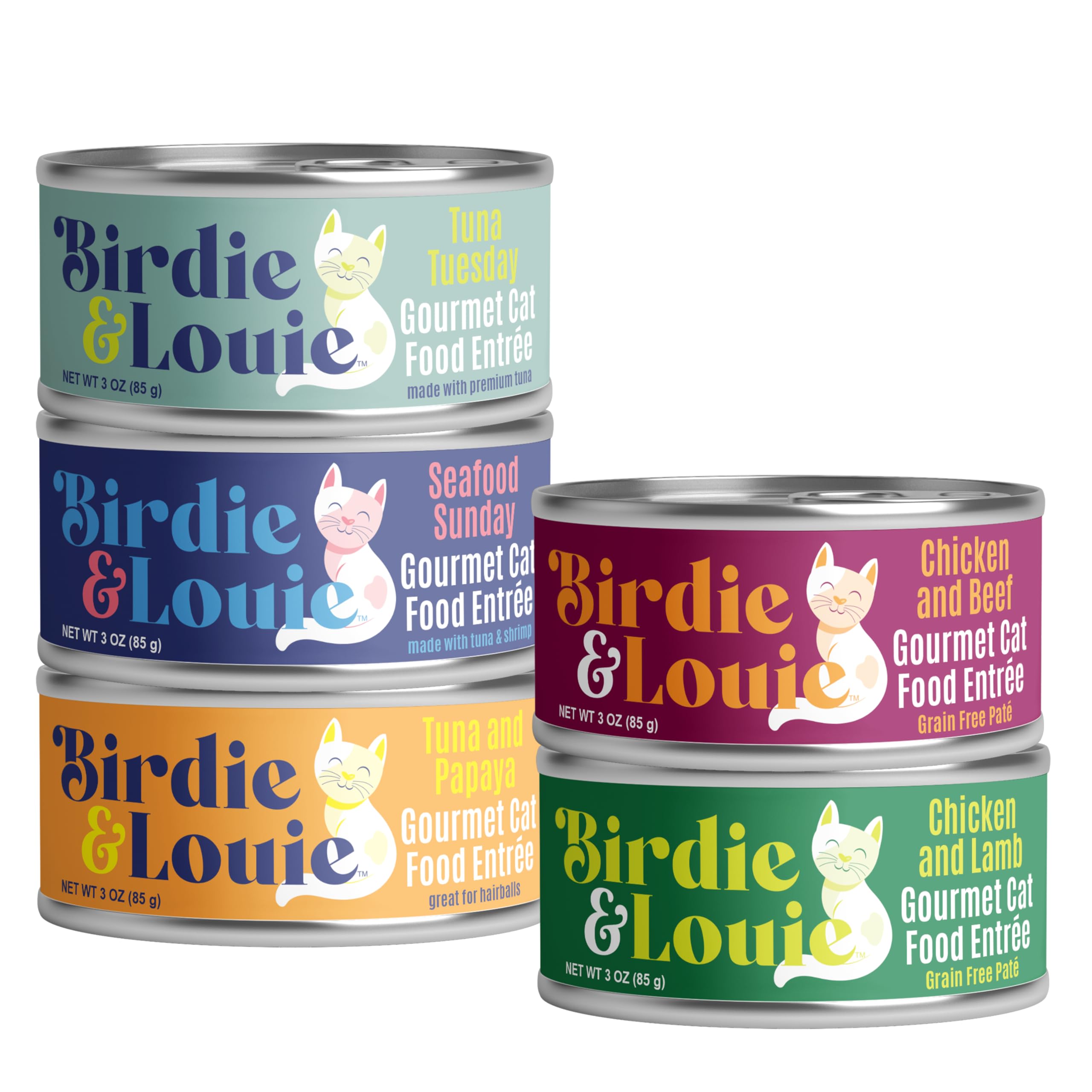 Birdie & Louie Wet Cat Food Variety Pack 30 Count, with 5 Different Proteins | Tuna, Shrimp, Chicken, Beef, Lamb | Flakes in Broth, and Pate | 6 Cans,|Pet Supplies