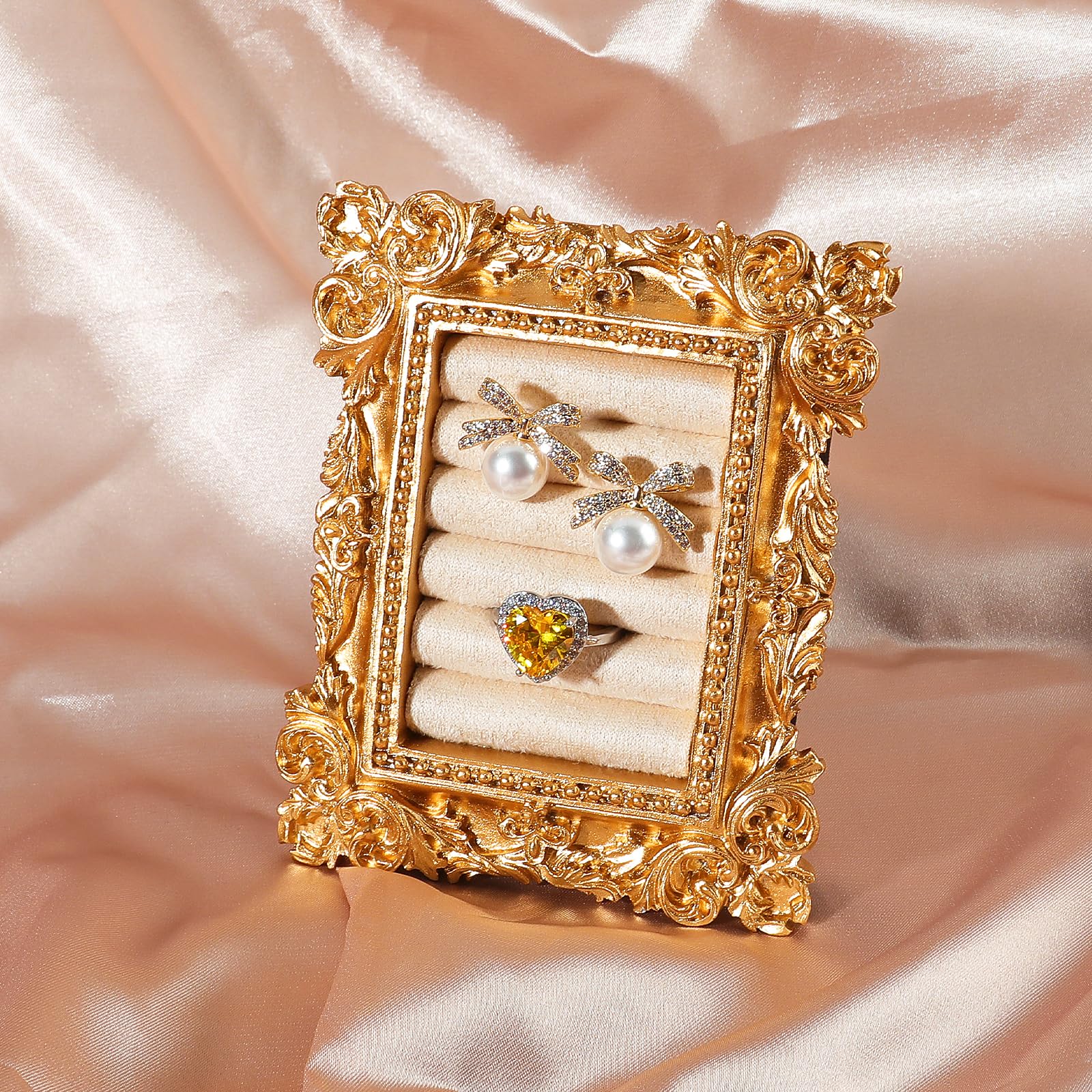 Vintage Ring Holder Rectangle Gold Velvet Display Stand - Baroque Jewelry Organizer Box Tray for Wedding Engagement Anniversary Women Birthday|Home & Garden