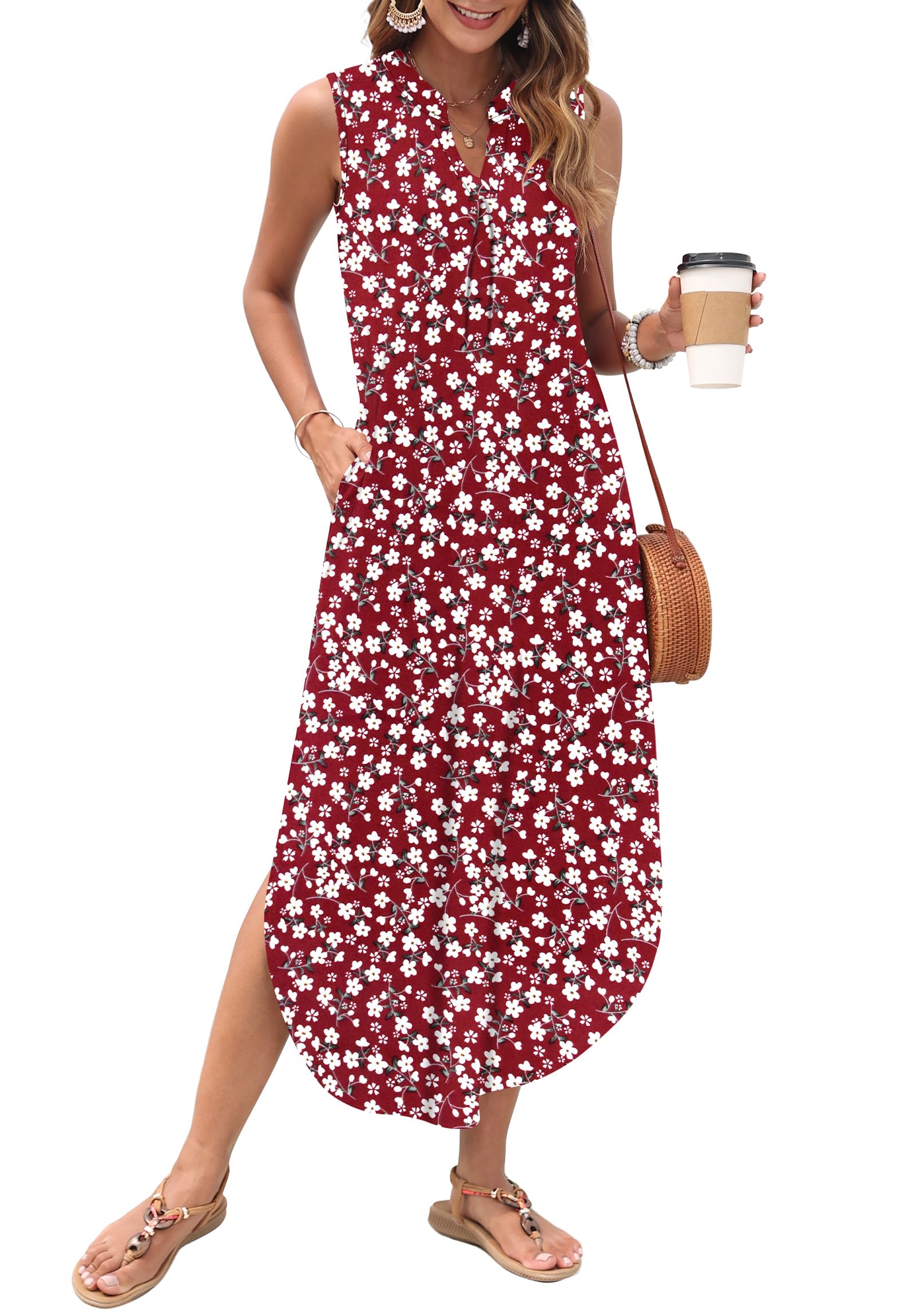 AUSELILY Womens Summer Casual Maxi Dresses 2026 Sleeveless Long Beach Dresses V Neck Loose Sundresses with Side Split Pockets|Clothing