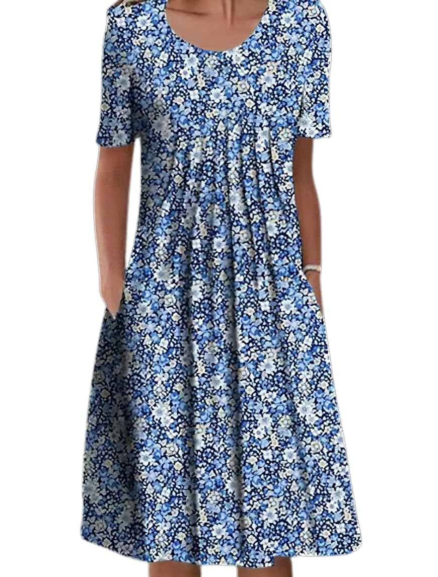 Akivide Women's Boho Floral Short Sleeve T Shirt Dress Summer Casual Loose Swing Tshirt Midi Dresses with Pockets|Clothing