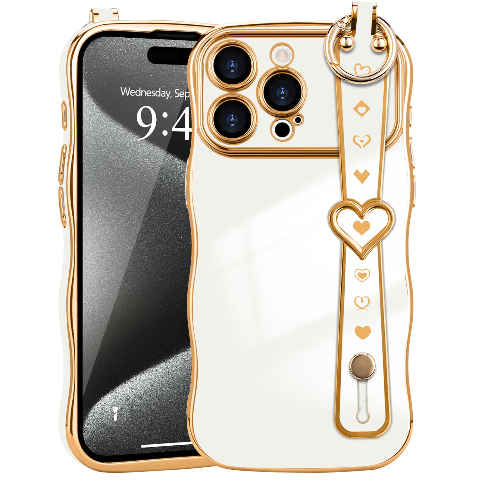 LLZ.COQUE for iPhone 15 Pro Max Case for Women Girls Wave Frame Strap Cute Love-Heart Luxury Plating Cover Raised Camera Protection Shockproof|Telephony