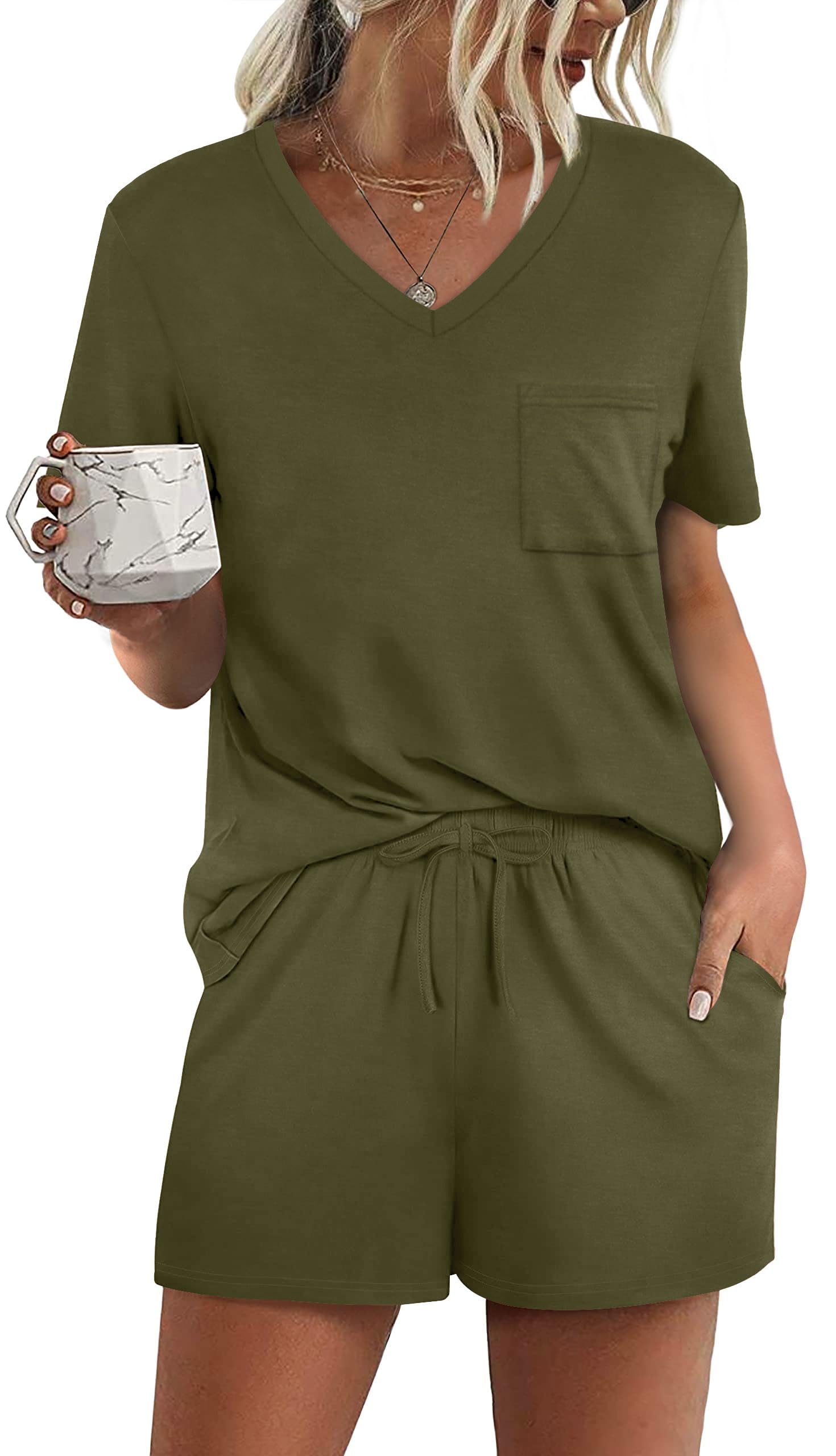 RUBZOOF Women's Short Sleeve Pajama Sets with Pockets Casual V Neck 2 Piece Lounge Sets S-3XL|Clothing