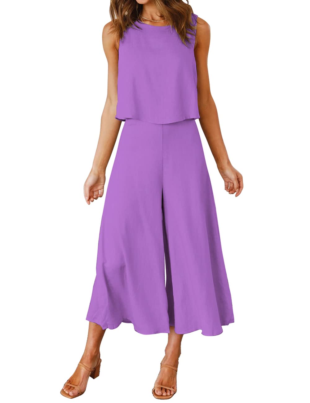 ROYLAMP Women's Summer 2 Piece Outfits Round Neck Crop Basic Top Cropped Wide Leg Pants Set Jumpsuits|Clothing
