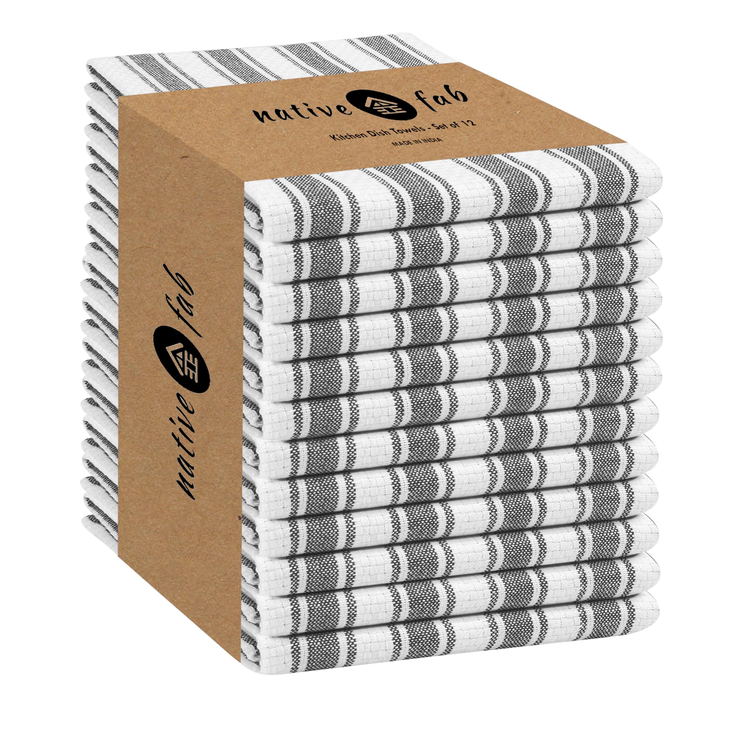 Native Fab Gray Stripe Kitchen Towels - 12 Pack - 100% Cotton, Basket Weave Striped Dishcloths Set - 16 x 26 Inches - Absorbent, Quick Drying, Durable|Home & Garden