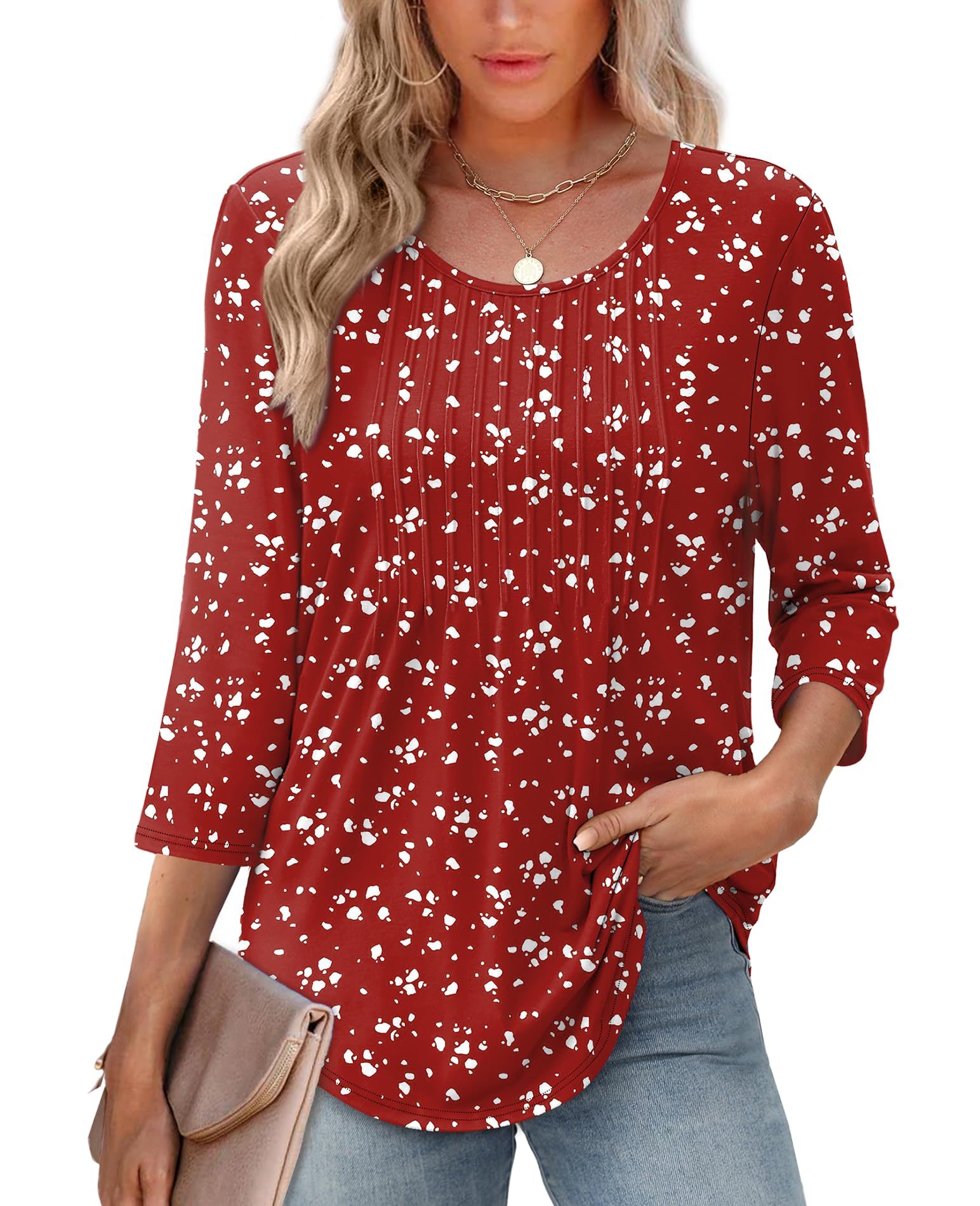 XIEERDUO 3/4 Length Sleeve Tops for Women 2026 Crewneck Casual Pleated Tunic Tops Shirts Blouses|Clothing