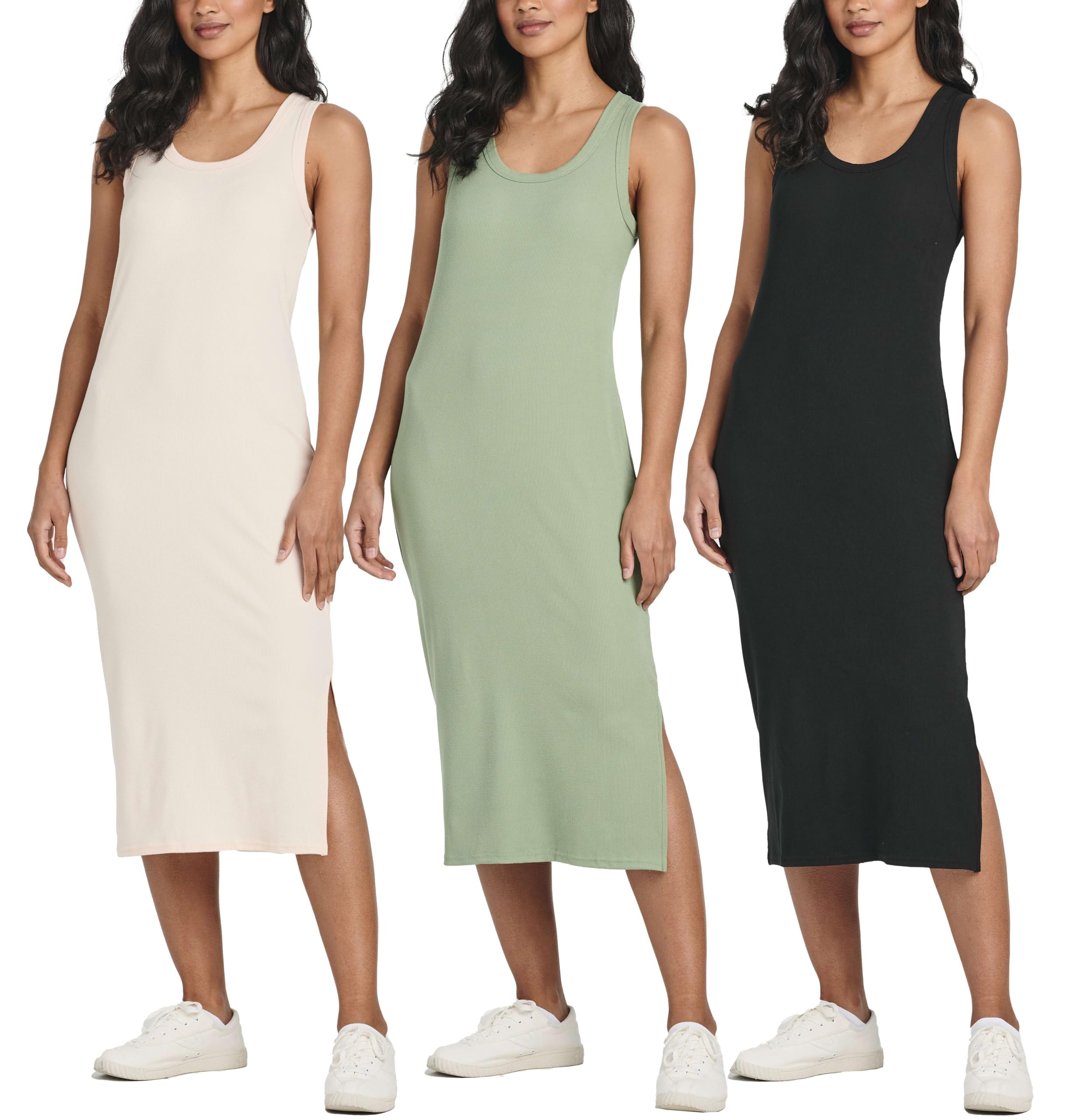 Real Essentials 3 Pack: Women's Ribbed Knit Sleeveless Crew Neck Tank Casual Midi Shift Dress with Slit|Clothing