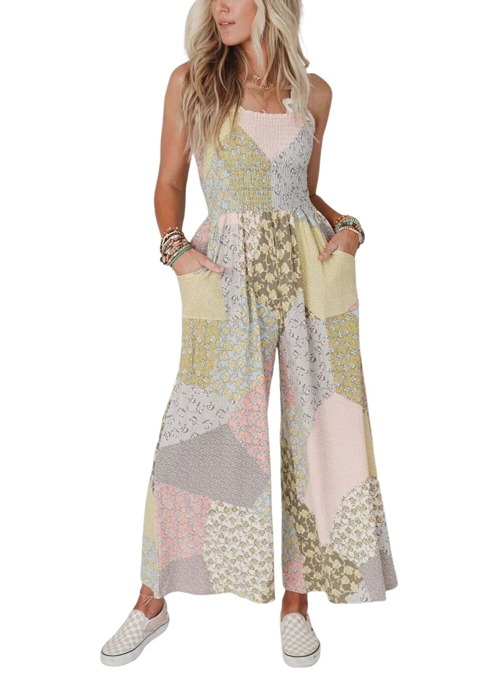 chouyatou Women's Wide Leg Smocked Jumpsuit Color Block Floral Print Sleeveless Romper Pants|Clothing