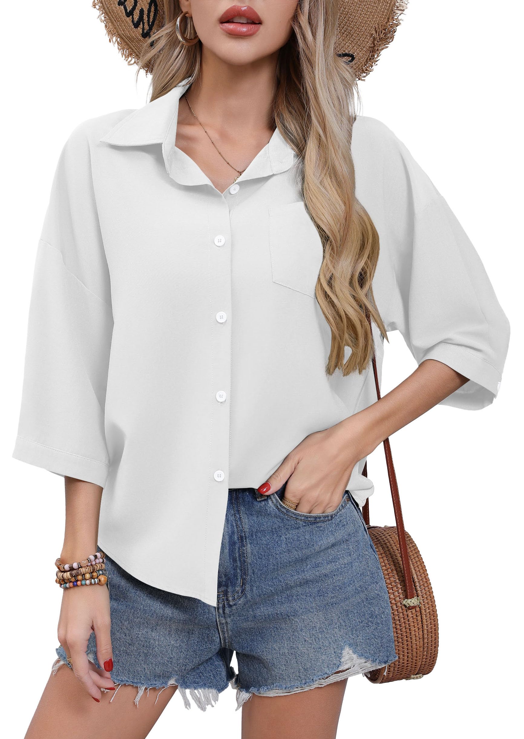 HIYIYEZI Women's Button Down Shirt Casual 3/4 Sleeve Dress Shirts Collared Work Blouse with Pocket|Clothing