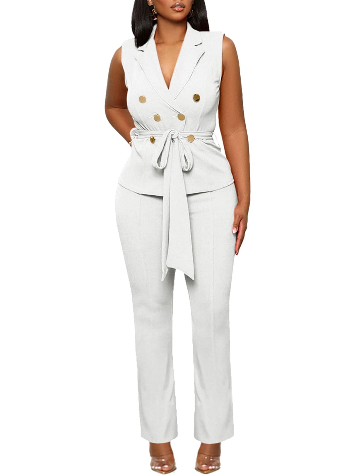 Blazer Pants Suits for Women Dressy Sleeveless Vest with Belt Wide Leg Pants 2 Piece Outfits Business Set Casual Suiting|Clothing