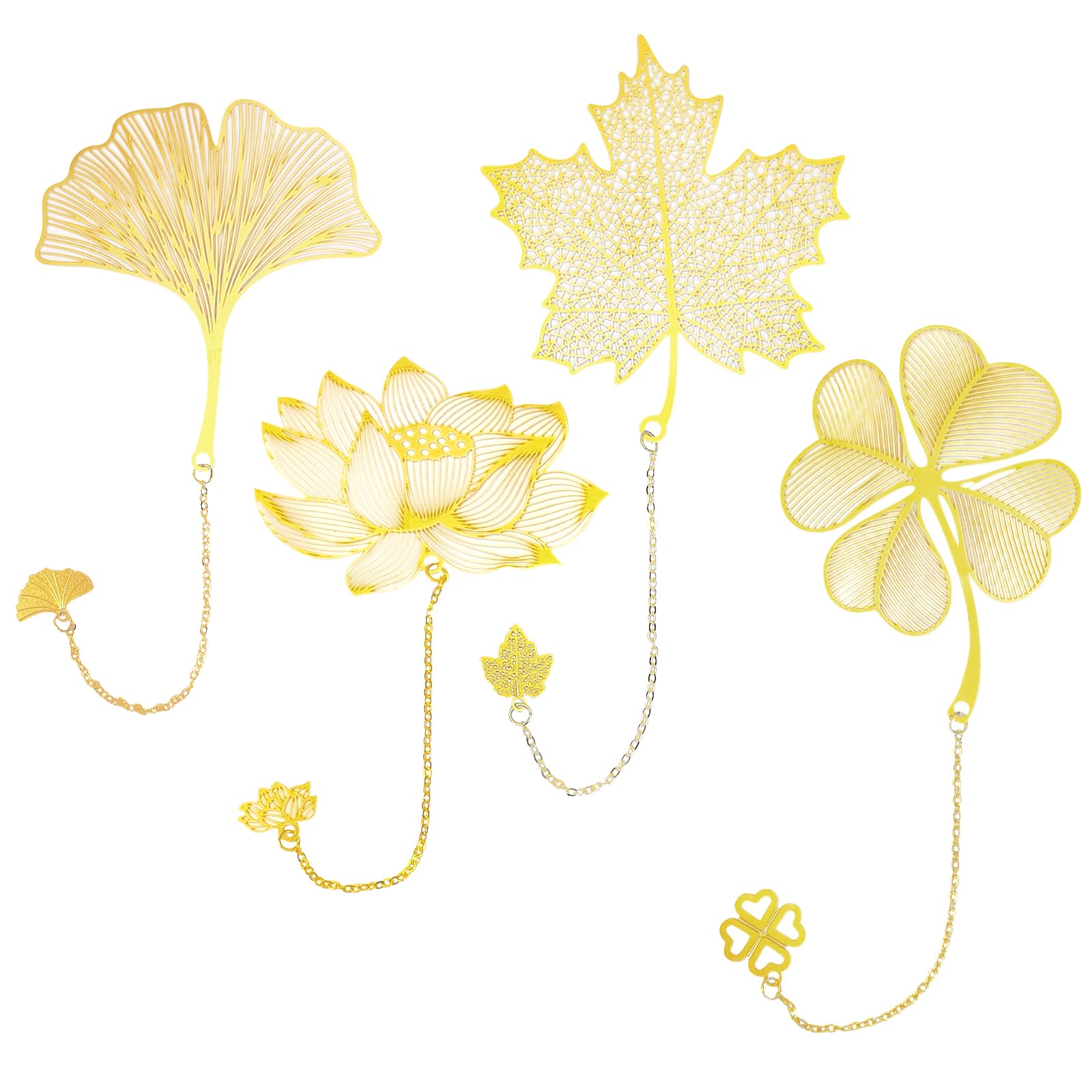 HFZRZFH 4 Pcs Golden Metal Leaf Bookmark Set with Chain, Unique Brass Page Markers Featuring Ginkgo, Maple, Clover, and Lotus, Book Lover Gifts for|Office Supplies