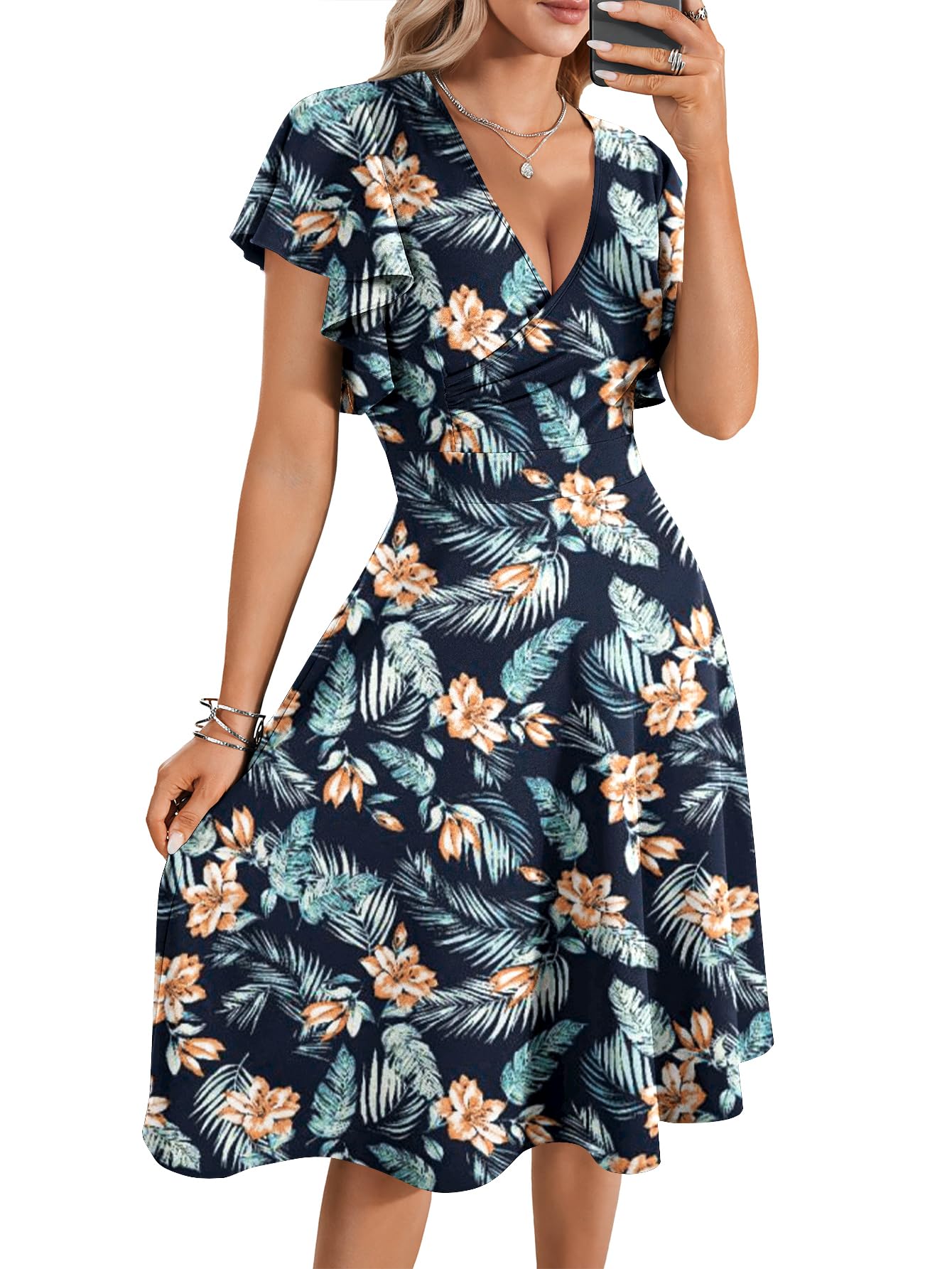 LYANER Women's Warp V Neck Ruffle Short Sleeve A Line Swing Flared Cocktail Party Midi Dress|Clothing