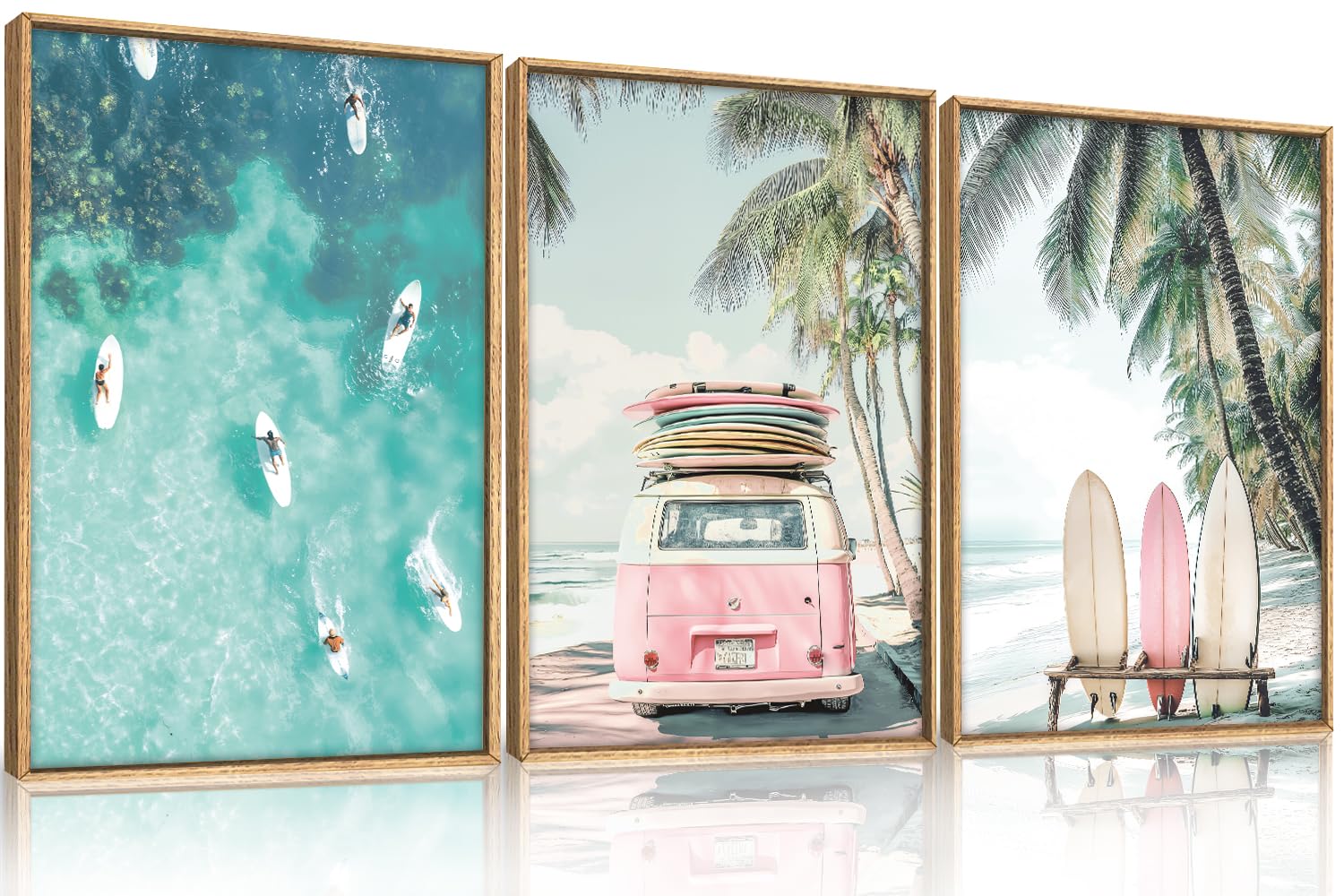 HOURIA Summer Surfboard Beach Framed Canvas Wall Art Set,Modern Ocean Surfing Seascape Wall Decor,Coastal Bus Coconut Tree Wall Painting,Nature|Home & Garden