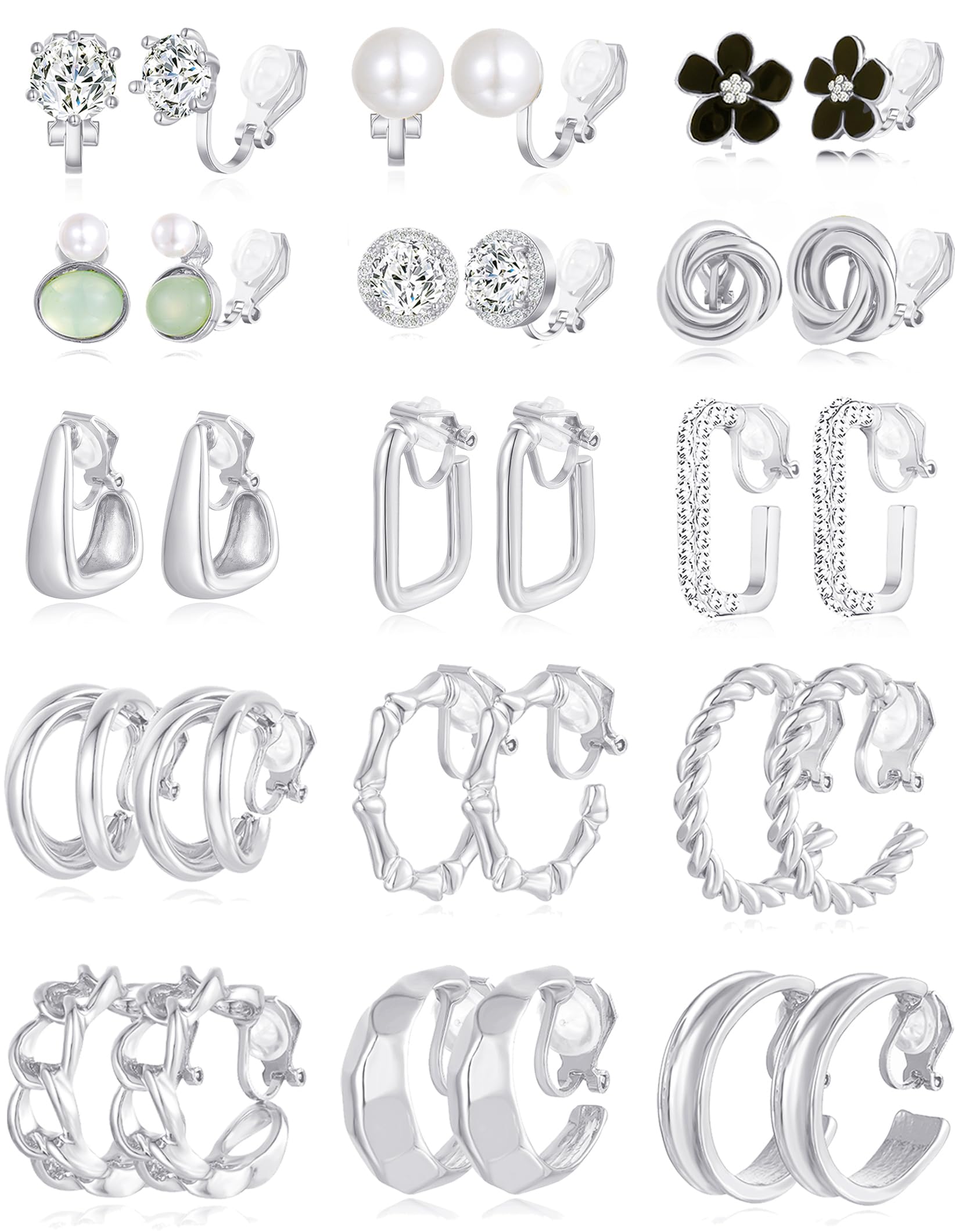 Wrlcorly 15 Pairs Clip on Earrings for Women Chunky Hoop Clip Earring Round CZ Twist Simulated Pearl Flower Knot No Piercing Fake Stud Earrings Sets|Jewelry