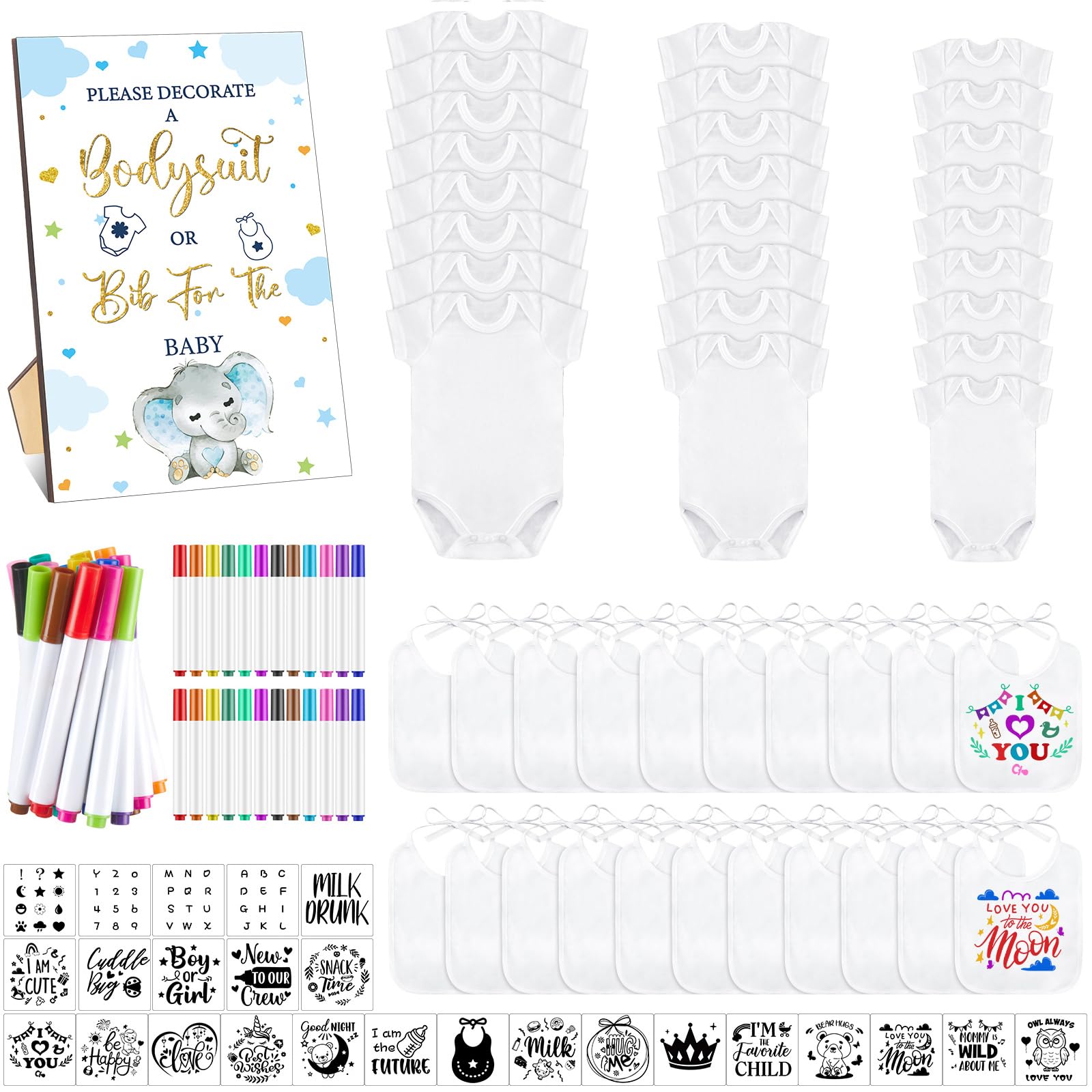 Panitay 100 Pcs Blank Bib Bodysuit Baby Shower Set Baby Shower Sign Blank Feeder Bib DIY Bodysuit Fabric Colorful Marker(Elephant)|Baby & Toddler