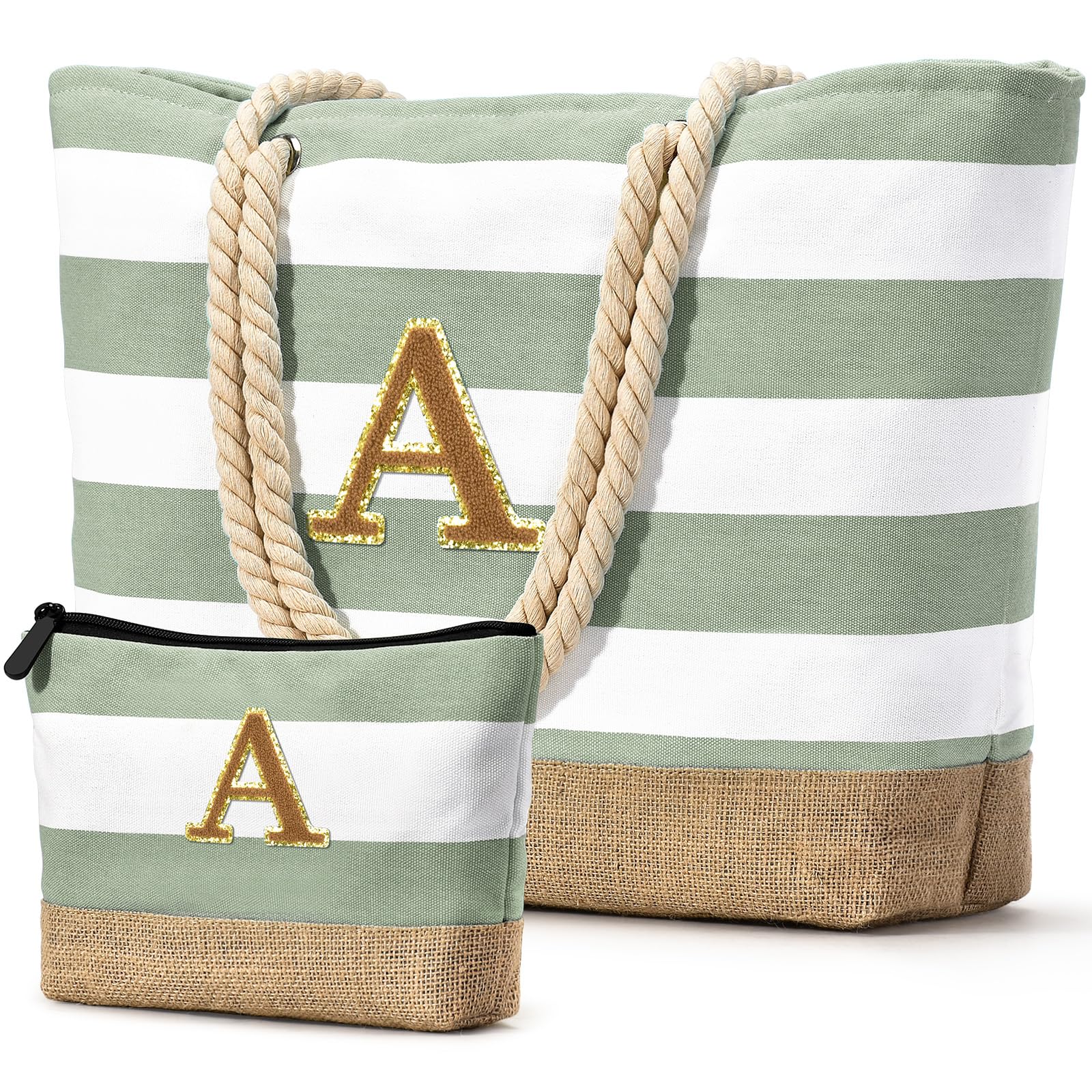 Becokan Beach Bag Initial Beach Tote with Makeup Bag for Travel Work Storage Personalized Birthday Gifts for Women Her|Shoes